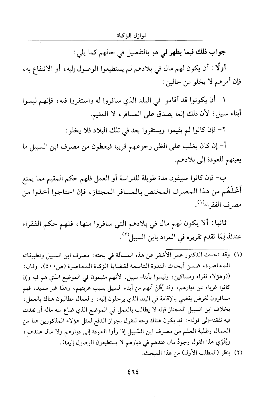 (¬1) وقد تحدث الدكتور عمر الأشقر عن هذه المسألة في بحثه: مصرف ابن السبيل وتطبيقاته المعاصرة، ضمن أبحاث الندوة التاسعة لقضايا الزكاة المعاصرة (ص 400)، وقال: " وهؤلاء فقراء ومساكين، وليسوا بأبناء سبيل، لأنهم مقيمون في الموضع الذي هم فيه وإن كانوا غرباء عن ديارهم، وقد يُظَنّ أنهم من أبناء السبيل بسبب غربتهم، وهذا غير سديد، فهم مسافرون لغرض يقضي بالإقامة في البلد الذي يرحلون إليه، والعمال مطالبون هناك بالعمل، بخلاف ابن السبيل المجتاز فإنه لا يطالب بالعمل في الموضع الذي ضاع منه ماله أو نفدت فيه نفقته - إلى قوله -: قد يكون هناك وجه للقول بجواز الدفع لمثل هؤلاء المذكورين هنا من العمال وطلبة العلم من مصرف ابن السّبيل إذا رأوا العودة إلى ديارهم ولا مال عندهم، ويُقَوّي هذا القولَ وجودُ مال عندهم في ديارهم لا يستطيعون الوصول إليه".