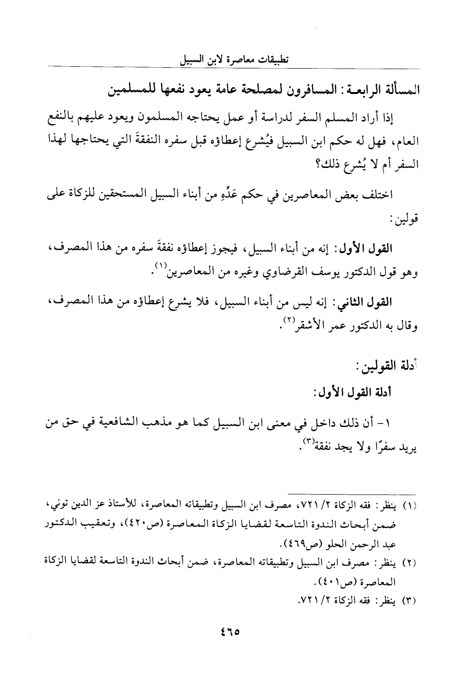 (¬1) ينظر: فقه الزكاة 2/ 721، مصرف ابن السبيل وتطبيقاته المعاصرة، للأستاذ عز الدين توني، ضمن أبحاث الندوة التاسعة لقضايا الزكاة المعاصرة (ص 420)، وتعقيب الدكتور عبد الرحمن الحلو (ص 469).