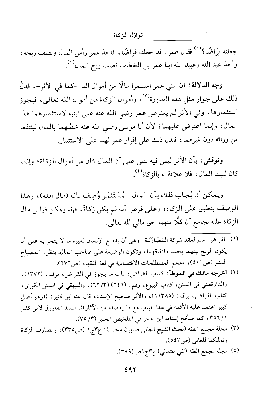 وجه الدلالة: أن ابني عمر استثمرا مالًا من أموال الله - كما في الأثر -، فدلَّ ذلك على جواز مثل هذه الصورة (¬3)، وأموال الزكاة من أموال الله تعالى، فيجوز استثمارها، وفي الأثر لم يعترض عمر رضي الله عنه على ابنيه لاستثمارهما هذا المال، وإنما اعترض عليهما؛ لأن أبا موسى رضي الله عنه خصهما بالمال لينتفعا من ورائه دون غيرهما، فيدل ذلك على إقرار عمر لهما على الاستثمار.