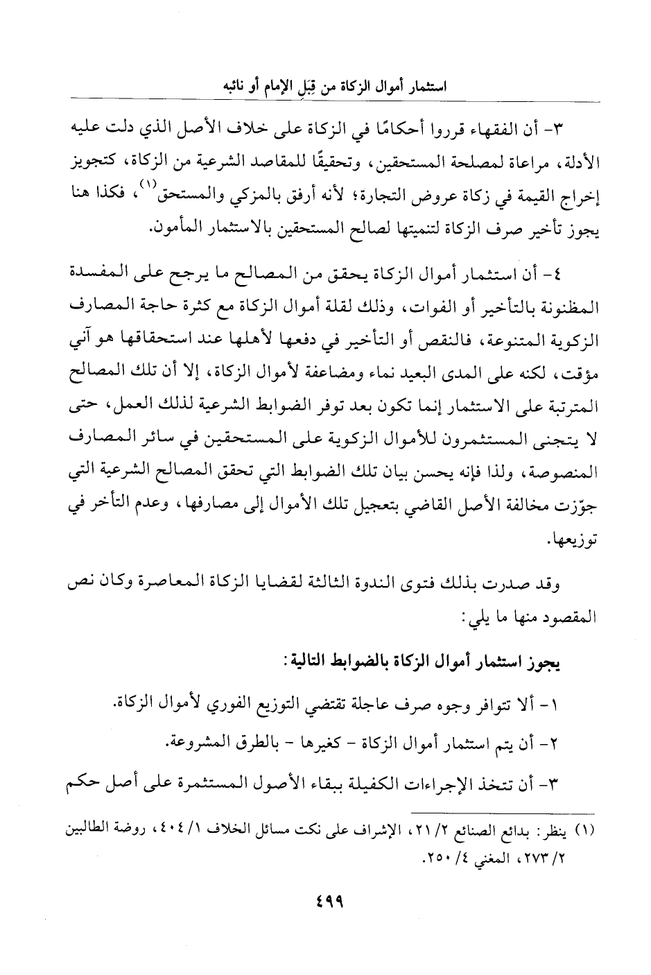 4 - أن استثمار أموال الزكاة يحقق من المصالح ما يرجح على المفسدة المظنونة بالتأخير أو الفوات، وذلك لقلة أموال الزكاة مع كثرة حاجة المصارف الزكوية المتنوعة، فالنقص أو التأخير في دفعها لأهلها عند استحقاقها هو آني مؤقت، لكنه على المدى البعيد نماء ومضاعفة لأموال الزكاة، إلا أن تلك المصالح المترتبة على الاستثمار إنما تكون بعد توفر الضوابط الشرعية لذلك العمل، حتى لا يتجنى المستثمرون للأموال الزكوية على المستحقين في سائر المصارف المنصوصة، ولذا فإنه يحسن بيان تلك الضوابط التي تحقق المصالح الشرعية التي جوّزت مخالفة الأصل القاضي بتعجيل تلك الأموال إلى مصارفها، وعدم التأخر في توزيعها.