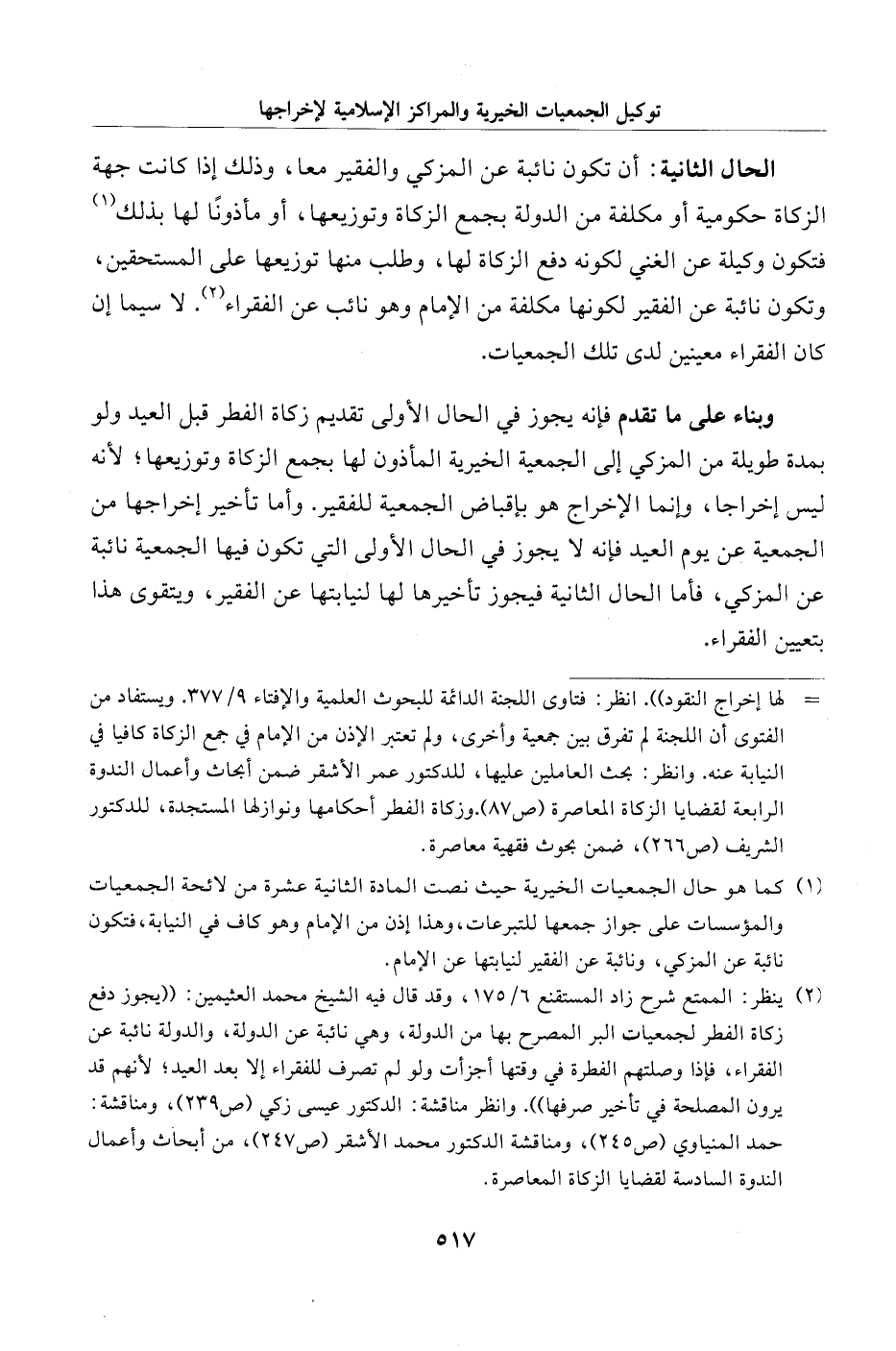 (¬1) كما هو حال الجمعيات الخيرية حيث نصت المادة الثانية عشرة من لائحة الجمعيات والمؤسسات على جواز جمعها للتبرعات، وهذا إذن من الإمام وهو كاف في النيابة، فتكون نائبة عن المزكي، ونائبة عن الفقير لنيابتها عن الإمام.