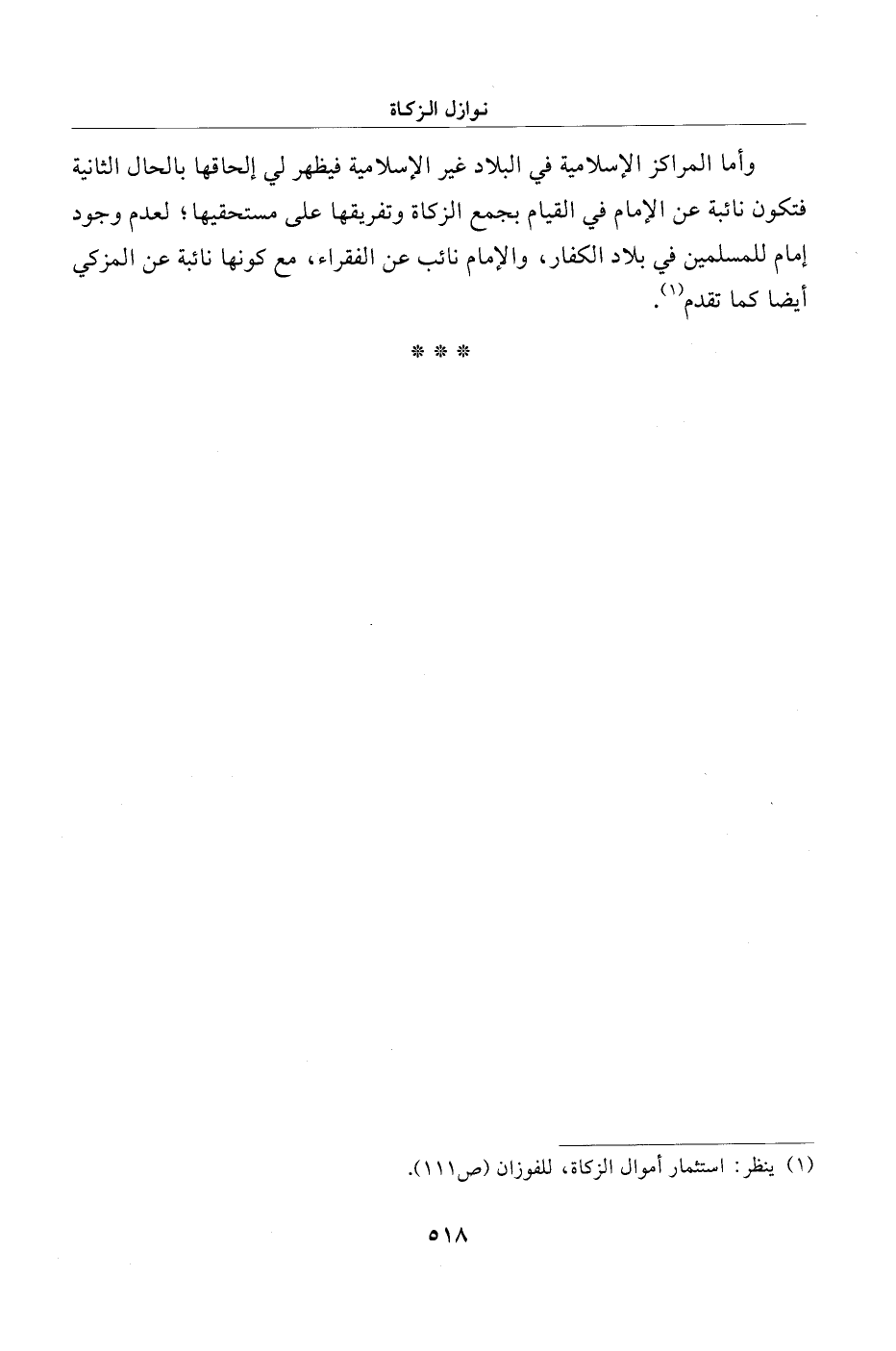 وأما المراكز الإسلامية في البلاد غير الإسلامية فيظهر لي إلحاقها بالحال الثانية فتكون نائبة عن الإمام في القيام بجمع الزكاة وتفريقها على مستحقيها؛ لعدم وجود إمام للمسلمين في بلاد الكفار، والإمام نائب عن الفقراء، مع كونها نائبة عن المزكي أيضا كما تقدم (¬1).