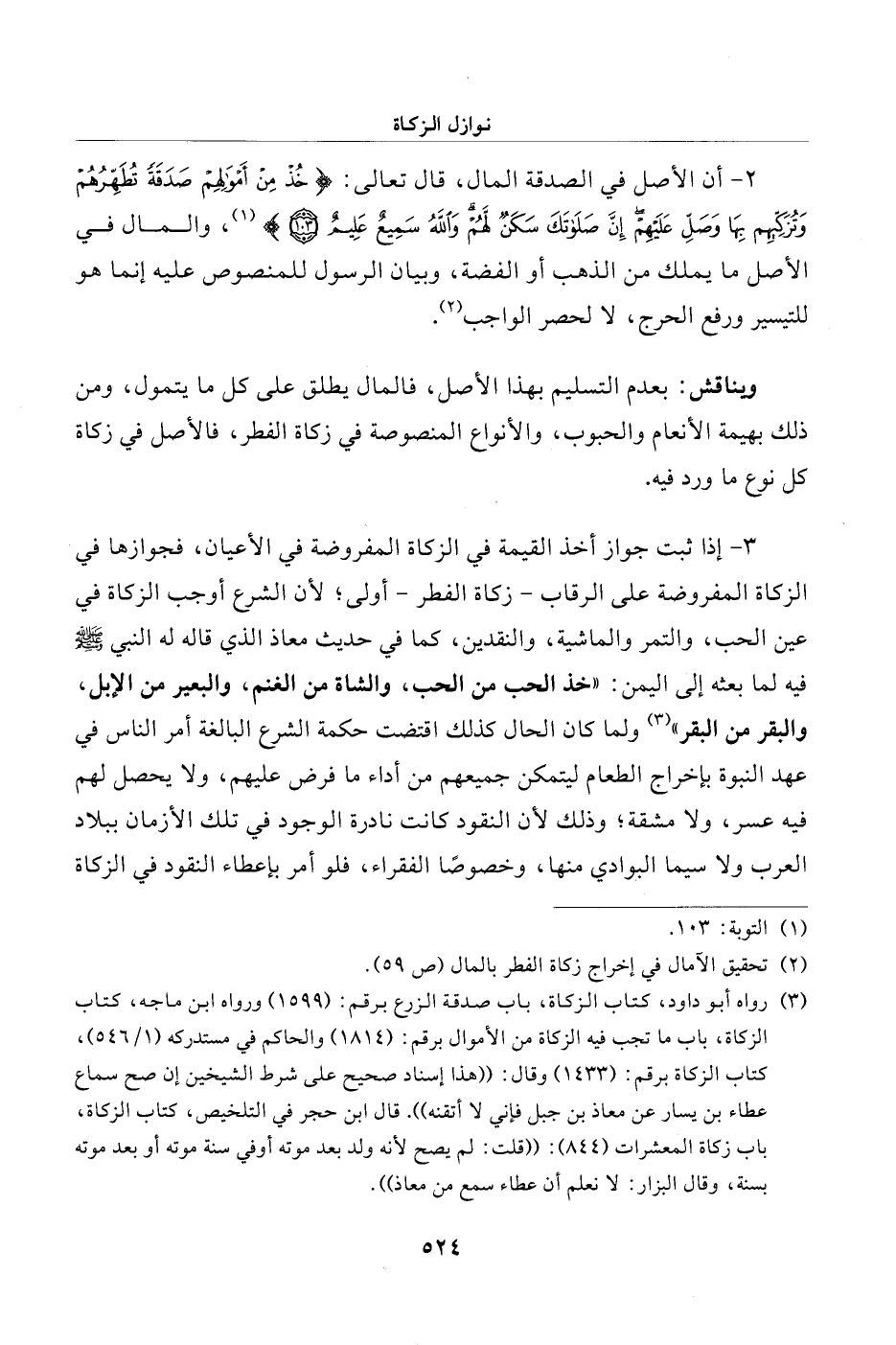 2 - أن الأصل في الصدقة المال، قال تعالى: {خُذْ مِنْ أَمْوَالِهِمْ صَدَقَةً تُطَهِّرُهُمْ وَتُزَكِّيهِمْ بِهَا وَصَلِّ عَلَيْهِمْ إِنَّ صَلَاتَكَ سَكَنٌ لَهُمْ وَاللَّهُ سَمِيعٌ عَلِيمٌ (103)} (¬1)، والمال في الأصل ما يملك من الذهب أو الفضة، وبيان الرسول للمنصوص عليه إنما هو للتيسير ورفع الحرج، لا لحصر الواجب (¬2).