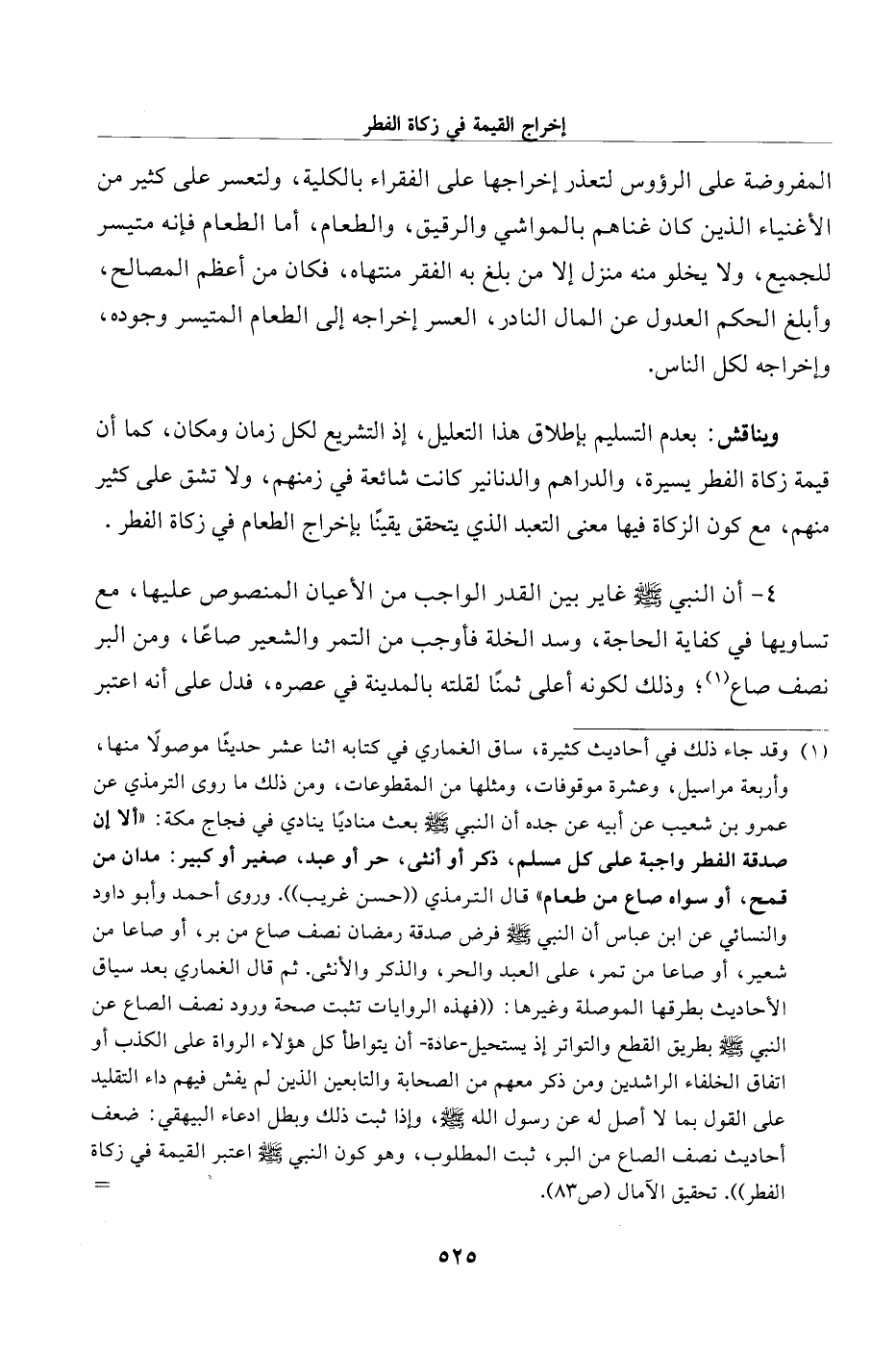 (¬1) وقد جاء ذلك في أحاديث كثيرة، ساق الغماري في كتابه اثنا عشر حديثًا موصولًا منها، وأربعة مراسيل، وعشرة موقوفات، ومثلها من المقطوعات، ومن ذلك ما روى الترمذي عن عمرو بن شعيب عن أبيه عن جده أن النبي - صلى الله عليه وسلم - بعث مناديًا ينادي في فجاج مكة: "ألا إن صدقة الفطر واجبة على كل مسلم، ذكر أو أنثى، حر أو عبد، صغير أو كبير: مدان من قمح، أو سواه صاع من طعام" قال الترمذي "حسن غريب". وروى أحمد وأبو داود والنسائي عن ابن عباس أن النبي - صلى الله عليه وسلم - فرض صدقة رمضان نصف صاع من بر، أو صاعا من شعير، أو صاعا من تمر، على العبد والحر، والذكر والأنثى. ثم قال الغماري بعد سياق الأحاديث بطرقها الموصلة وغيرها: "فهذه الروايات تثبت صحة ورود نصف الصاع عن النبي - صلى الله عليه وسلم - بطريق القطع والتواتر إذ يستحيل -عادة- أن يتواطأ كل هؤلاء الرواة على الكذب أو اتفاق الخلفاء الراشدين ومن ذكر معهم من الصحابة والتابعين الذين لم يفش فيهم داء التقليد على القول بما لا أصل له عن رسول الله - صلى الله عليه وسلم -، وإذا ثبت ذلك وبطل ادعاء البيهقي: ضعف أحاديث نصف الصاع من البر، ثبت المطلوب، وهو كون النبي - صلى الله عليه وسلم - اعتبر القيمة في زكاة الفطر". تحقيق الآمال (ص 83).=