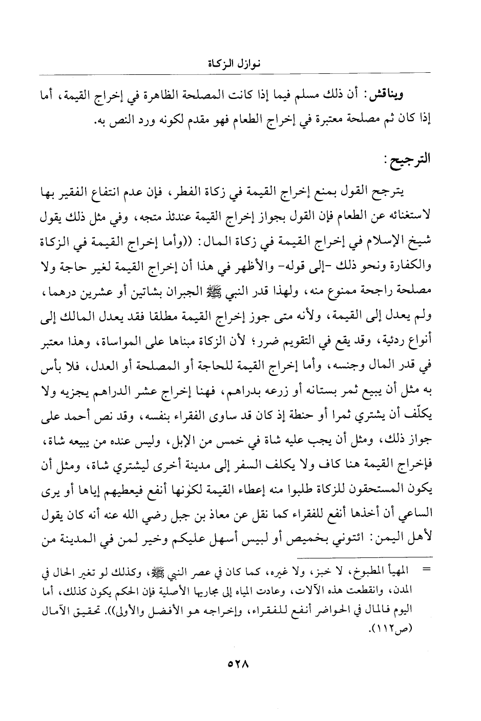 = المهيأ المطبوخ، لا خبز، ولا غيره، كما كان في عصر النبي - صلى الله عليه وسلم -، وكذلك لو تغير الحال في المدن، وانقطعت هذه الآلات، وعادت المياه إلى مجاريها الأصلية فإن الحكم يكون كذلك، أما اليوم فالمال في الحواضر أنفع للفقراء، وإخراجه هو الأفضل والأولى". تحقيق الآمال (ص 112).