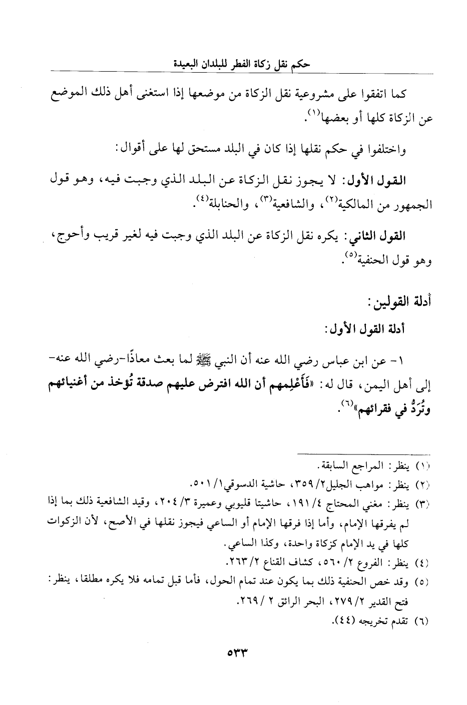 (¬3) ينظر: مغني المحتاج 4/ 191، حاشيتا قليوبي وعميرة 3/ 204، وقيد الشافعية ذلك بما إذا لم يفرقها الإمام، وأما إذا فرقها الإمام أو الساعي فيجوز نقلها في الأصح، لأن الزكوات كلها في يد الإمام كزكاة واحدة، وكذا الساعي.