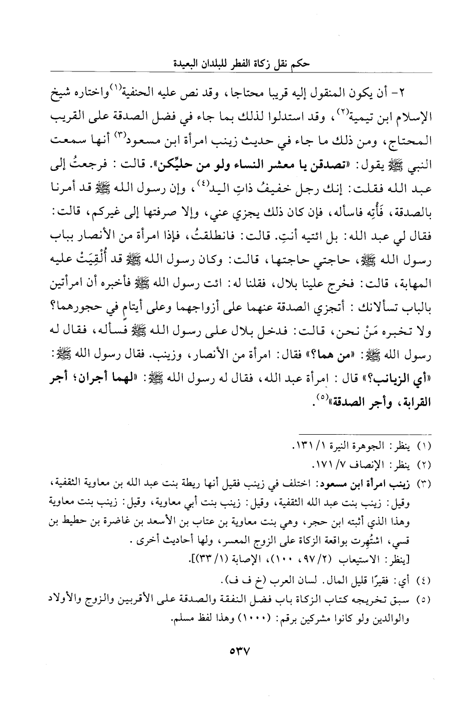 2 - أن يكون المنقول إليه قريبا محتاجا، وقد نص عليه الحنفية (¬1) واختاره شيخ الإسلام ابن تيمية (¬2)، وقد استدلوا لذلك بما جاء في فضل الصدقة على القريب المحتاج، ومن ذلك ما جاء في حديث زينب امرأة ابن مسعود (¬3) أنها سمعت النبي - صلى الله عليه وسلم - يقول: "تصدقن يا معشر النساء ولو من حليِّكن". قالت: فرجعتُ إلى عبد الله فقلت: إنك رجل خفيفُ ذاتِ اليد (¬4)، وإن رسول الله - صلى الله عليه وسلم - قد أمرنا بالصدقة، فَأْتِه فاسأله، فإن كان ذلك يجزي عني، وإلا صرفتها إلى غيركم، قالت: فقال لي عبد الله: بل ائتيه أنتِ. قالت: فانطلقتُ، فإذا امرأة من الأنصار بباب رسول الله - صلى الله عليه وسلم -، حاجتي حاجتها، قالت: وكان رسول الله - صلى الله عليه وسلم - قد أُلْقِيَتْ عليه المهابة، قالت: فخرج علينا بلال، فقلنا له: ائت رسول الله - صلى الله عليه وسلم - فأخبره أن امرأتين بالباب تسألانك: أتجزي الصدقة عنهما على أزواجهما وعلى أيتامٍ في حجورهما؟ ولا تخبره مَنْ نحن، قالت: فدخل بلال على رسول الله - صلى الله عليه وسلم - فسأله، فقال له رسول الله - صلى الله عليه وسلم -: "من هما؟ " فقال: امرأة من الأنصار، وزينب. فقال رسول الله - صلى الله عليه وسلم -: "أي الزيانب؟ " قال: امرأة عبد الله، فقال له رسول الله - صلى الله عليه وسلم -: "لهما أجران؛ أجر القرابة، وأجر الصدقة" (¬5).