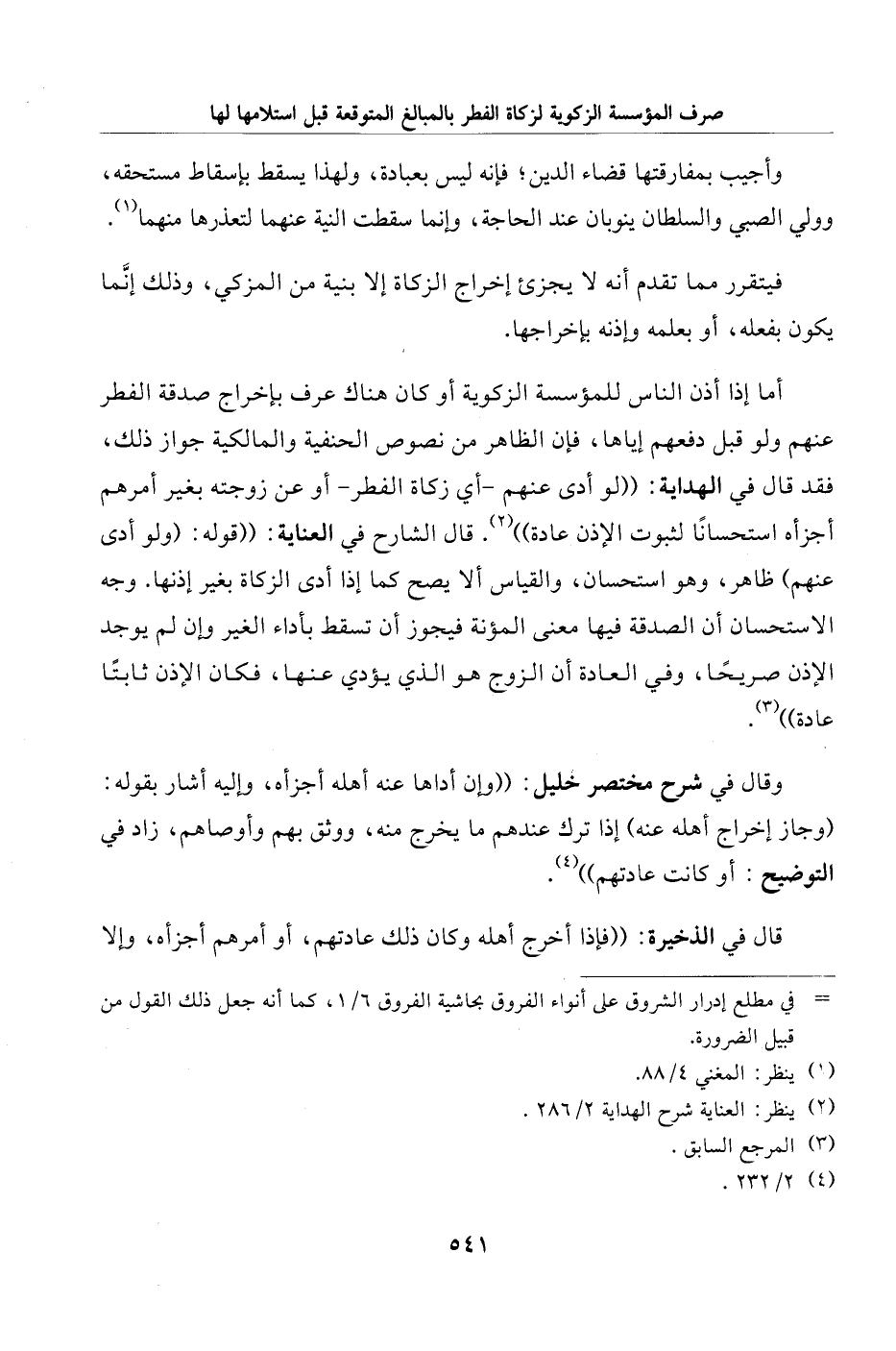 أما إذا أذن الناس للمؤسسة الزكوية أو كان هناك عرف بإخراج صدقة الفطر عنهم ولو قبل دفعهم إياها، فإن الظاهر من نصوص الحنفية والمالكية جواز ذلك، فقد قال في الهداية: "لو أدى عنهم -أي زكاة الفطر- أو عن زوجته بغير أمرهم أجزأه استحسانًا لثبوت الإذن عادة" (¬2). قال الشارح في العناية: "قوله: (ولو أدى عنهم) ظاهر، وهو استحسان، والقياس ألا يصح كما إذا أدى الزكاة بغير إذنها. وجه الاستحسان أن الصدقة فيها معنى المؤنة فيجوز أن تسقط بأداء الغير وإن لم يوجد الإذن صريحًا، وفي العادة أن الزوج هو الذي يؤدي عنها، فكان الإذن ثابتًا عادة" (¬3).