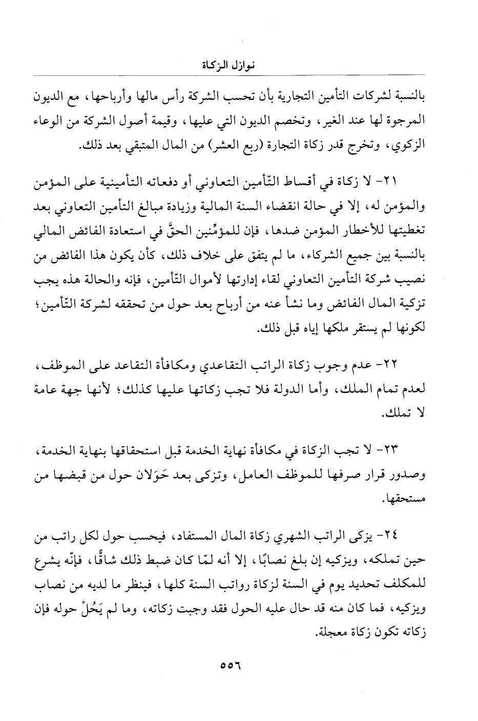 23 - لا تجب الزكاة في مكافاة نهاية الخدمة قبل استحقاقها بنهاية الخدمة، وصدور قرار صرفها للموظف العامل، وتزكى بعد حَوَلان حول من قبضها من مستحقها.