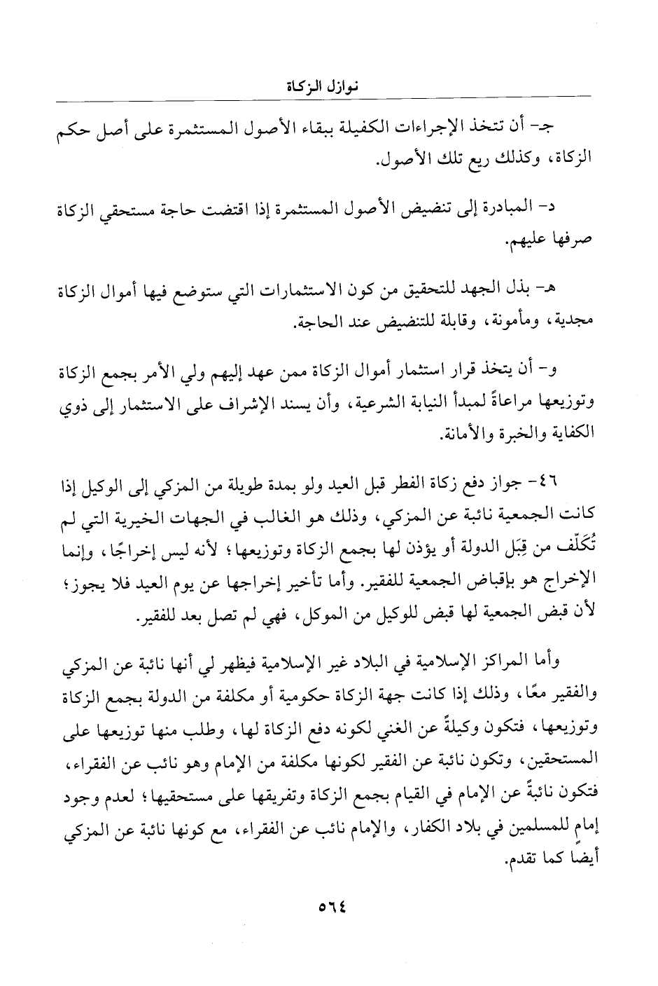 و- أن يتخذ قرار استثمار أموال الزكاة ممن عهد إليهم ولي الأمر بجمع الزكاة وتوزيعها مراعاةً لمبدأ النيابة الشرعية، وأن يسند الإشراف على الاستثمار إلى ذوي الكفاية والخبرة والأمانة.