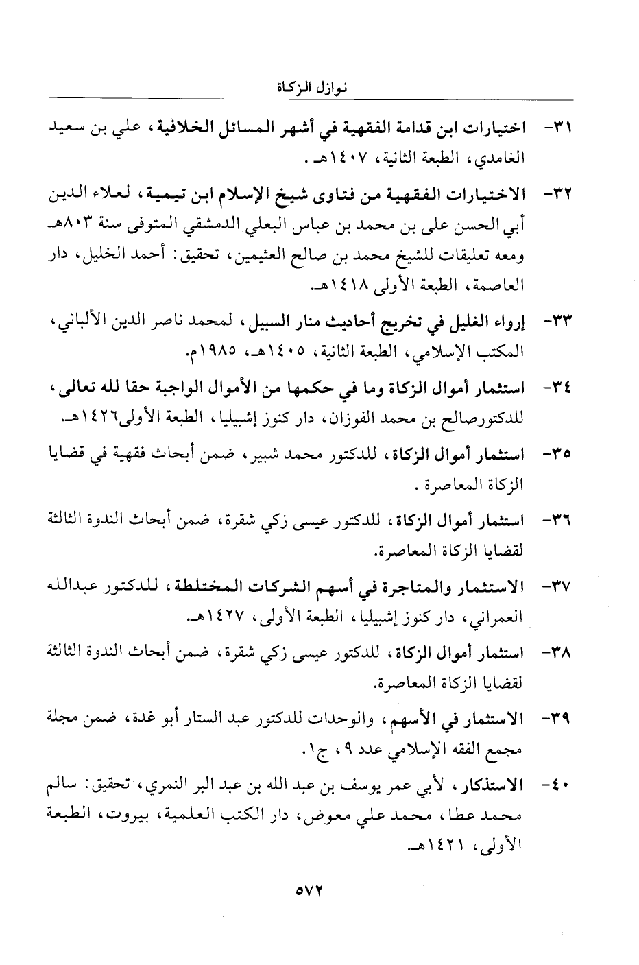 34 - استثمار أموال الزكاة وما في حكمها من الأموال الواجبة حقا لله تعالى، للدكتور صالح بن محمد الفوزان، دار كنوز إشبيليا، الطبعة الأولى 1426 هـ.