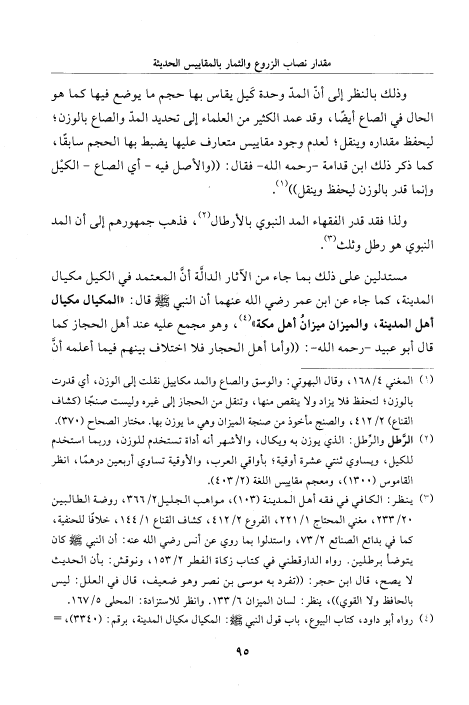 (¬1) المغني 4/ 168، وقال البهوتي: والوسق والصاع والمد مكاييل نقلت إلى الوزن، أي قدرت بالوزن، لتحفظ فلا يزاد ولا ينقص منها، وتنقل من الحجاز إلى غيره وليست صنجًا (كشاف القناع) 2/ 412، والصنج مأخوذ من صنجة الميزان وهي ما يوزن بها. مختار الصحاح (370).