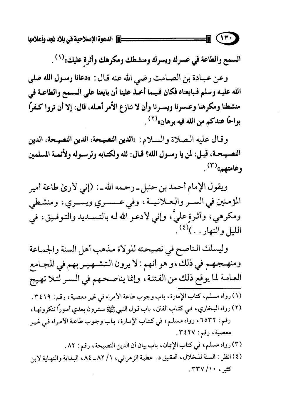 أصول عظيمة مفيدة جليلة حيث قال: " الأصل الثاني: أمر الله بالاجتماع في الدين ونهى عن التفرق.. إلى أن قال: الأصل الثالث: أن من تمام الاجتماع السمع والطاعة لمن تأمر علينا ولو كان عبدا حبشيا، فبين النبي صلى الله عليه وسلم هذا بيانا شائعا ذائعا بكل أنواع البيان شرعا وقدرا، ثم صار هذا الأصل لا يعرف عند أكثر من يدعي العلم فكيف العمل به"1.