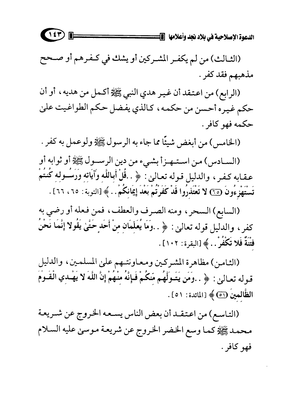 إلى أن يقول: " وإن من أظهر التوحيد والإسلام وجب الكف عنه إلى أن يتبين منه ما يناقض ذلك"1.