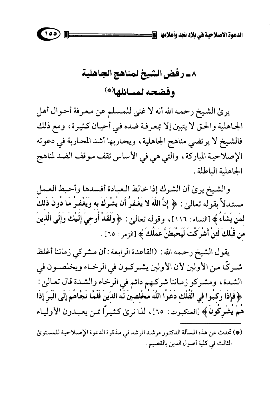 ولما رأى الشيخ رحمه الله ما عليه الناس من البعد عن دين الله تعالى، والانحراف في الأخلاق، وشيوع المنكرات، وتفشي الخرافات في المجتمع إذ ذاك، قام بالجهر بدعوته الإصلاحية المباركة، فرفض أمور الجاهلية كلها وفضح مسائلها وكشف أباطيلها، وذلك من خلال دعوة الناس للرجوع إلى ما كان عليه الصدر الأول من هذه الأمة في عهد الرسول صلى الله عليه وسلم وصحابته الكرام والتابعين لهم بإحسان، فسعى لتخليص التوحيد وتجريده من شوائب الشرك، وقام بإنكار التوسل الممنوع شرعا بالأولياء والصالحين، والتبرك بالأشجار والأحجار وغير ذلك، وجهر أيضا بمحاربة البدع وسائر الخرافات مدعما ما يقول بآيات القرآن الكريم وأحاديث الرسول صلى الله عليه وسلم وأقوال