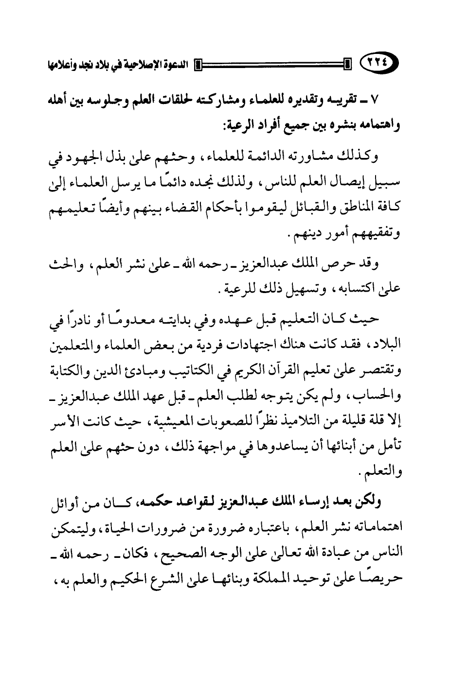 3ـ السعي إلى جعل التعليم الابتدائي مجانيا، مع ضعف الإمكانات المادية والبشرية في ذلك الوقت، مما يدل على الرؤية الواضحة لأهمية العلم والتعليم لدى قيادات هذه الدولة المباركة حتى في أوقات الشدة"1.