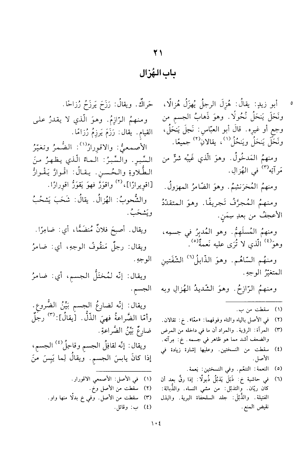 أبو زيد: يقال: هزل الرجل يهزل هزالا، ونحل ينحل نحولا. وهو ذهاب الجسم من وجع أو غيره. قال أبو العباس: نحل ينحل، ونحل ينحل وينحل، يقالان جميعا.