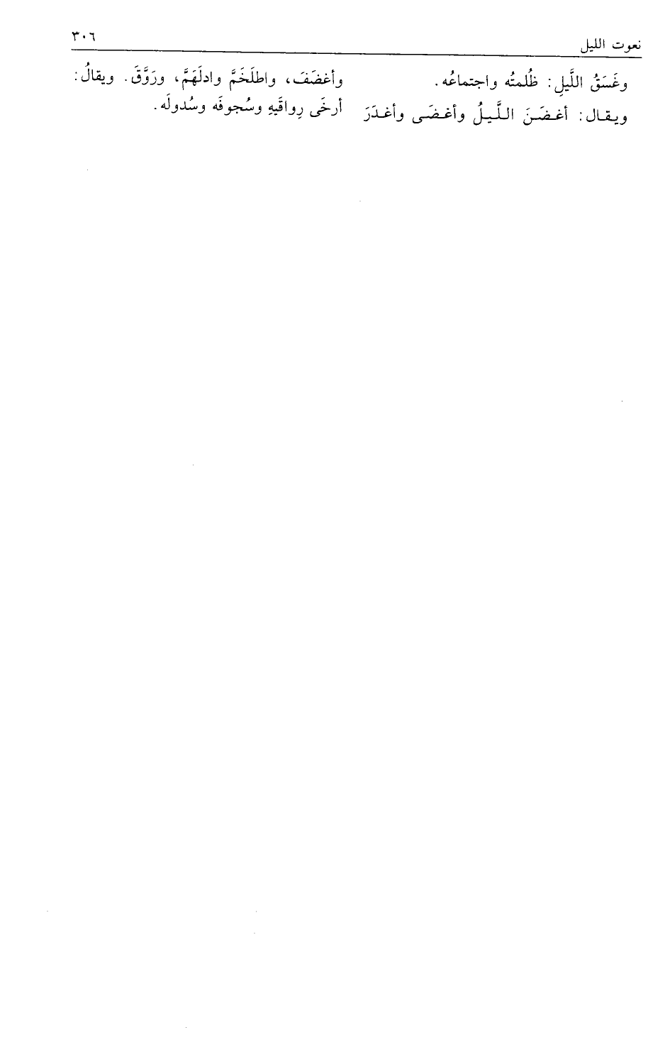 ويقال: أغضن الليل وأغضى وأغدر وأغضف، واطلخم وادلهم، وروق. ويقال: أرخى رواقيه وسجوفه وسدوله.