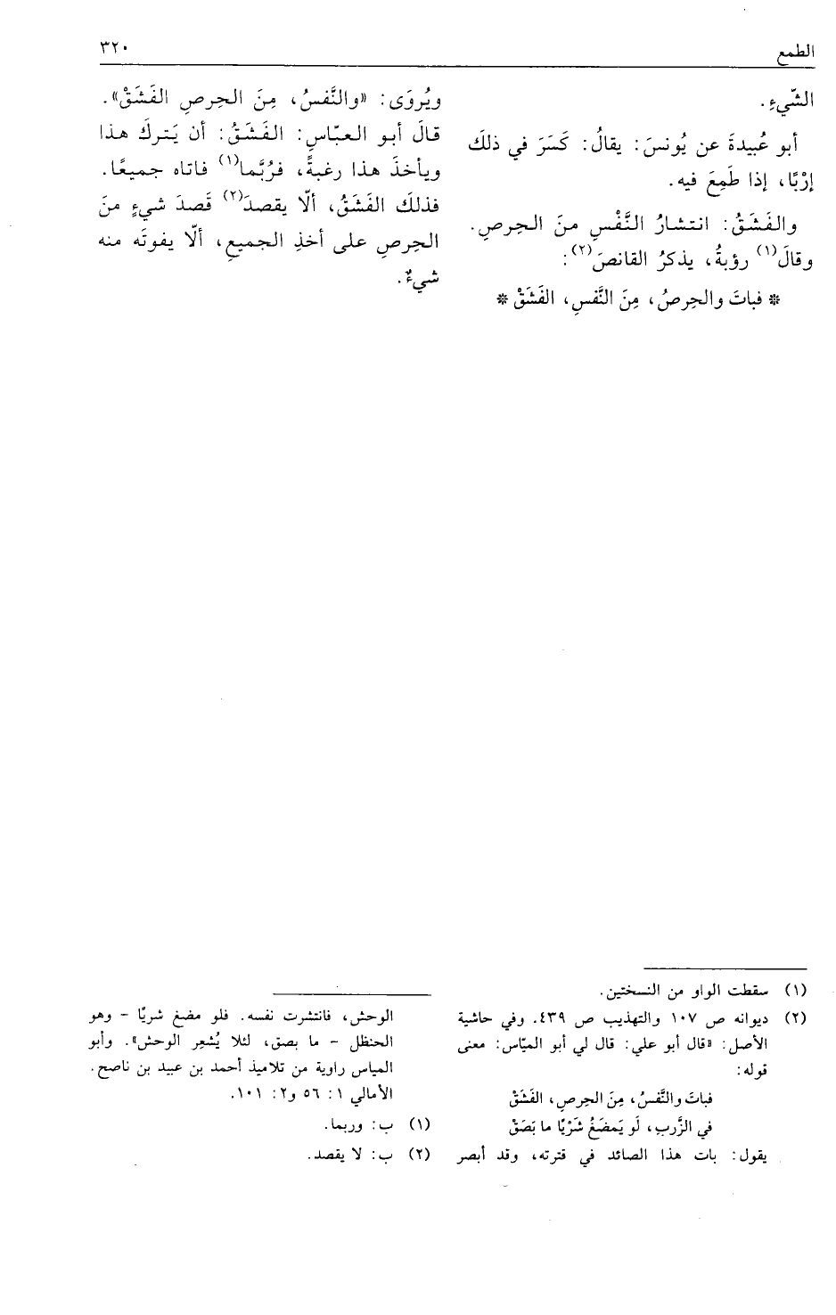 ويروى: "والنفس، من الحرص الفشق". قال أبو العباس: الفشق: أن يترك هذا ويأخذ هذا رغبة، فربما فاتاه جميعا. فذلك الفشق، ألا يقصد قصد شيء من الحرص على أخذ الجميع، ألا يفوته منه شيء.