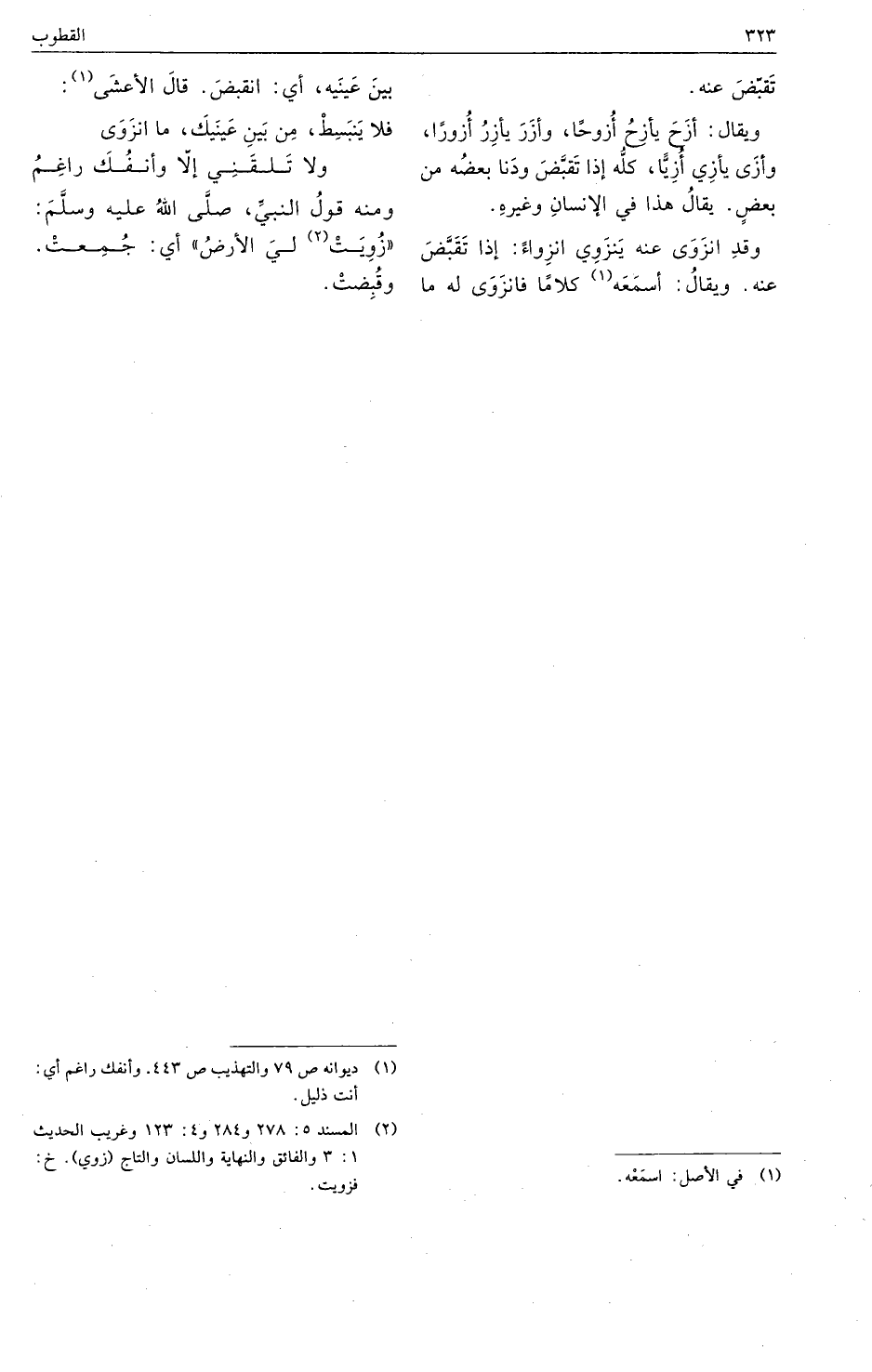 ومنه قول النبي، صلى الله عليه وسلم: "زويت لي الأرض" أي: جمعت وقبضت.