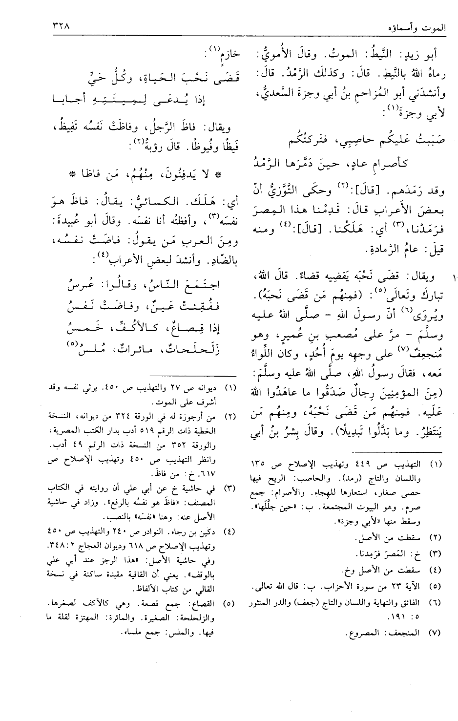 ويقال: قضى نحبه يقضيه قضاء. قال الله تبارك وتعالى: {فمِنهُم مَن قَضَى نَحبَهُ}. ويروى أن رسول الله -صلى الله عليه وسلم- مر على مصعب بن عمير، وهو منجعف على وجهه يوم أحد، وكان اللواء معه، فقال رسول الله، صلى الله عليه وسلم: {مِنَ المؤمِنِينَ رِجالٌ صَدَقُوا ما عاهَدُوا اللهَ عَلَيه فمِنهُم مَن قَضَى نَحْبَهُ ومِنهُم مَن يَنتَظِرُ وما بَدَّلُوا تَبدِيلًا}. وقال بشر بن أبي خازم: