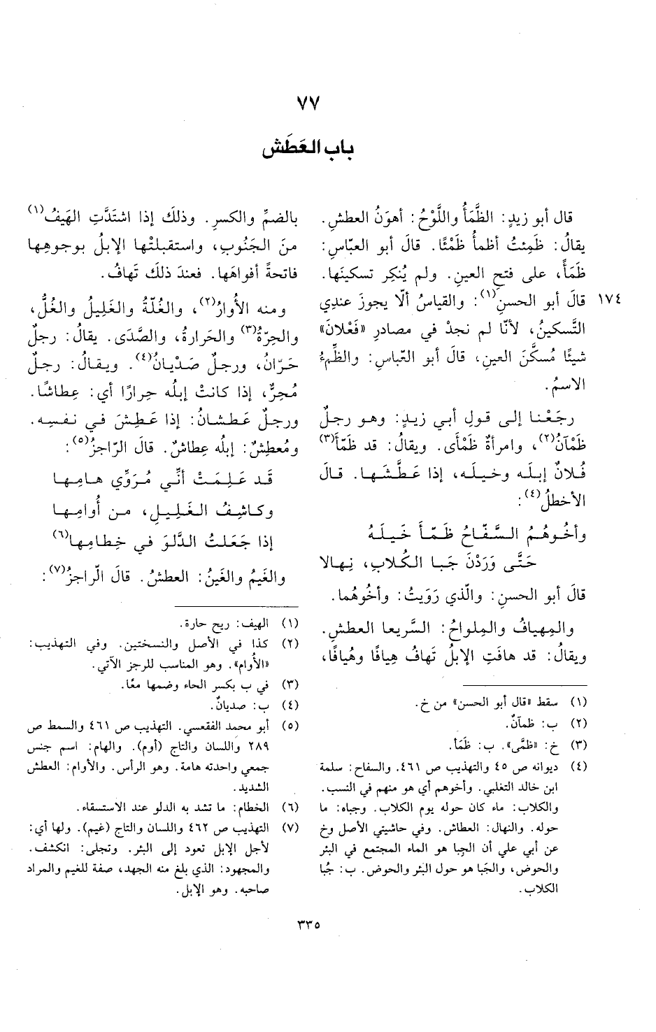 رجعنا إلى أقول أبي زيد: وهو رجل ظمآن، وامرأة ظمأى. ويقال: قد ظمأ فلان إبله وخيله، إذا عطشها. قال الأخطل: