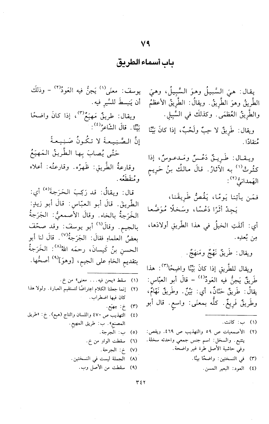 ويقال للطريق إذا كان بينا واضحا: هذا طريق يحن فيه العود - قال أبو العباس: يقال: طريق حنان، أي: بين. وطريق نهام، وطريق فريغ. كله بمعنى: واسع. قال أبو يوسف: معنى يحن فيه العود - وذلك أن ينبسط للسير فيه.