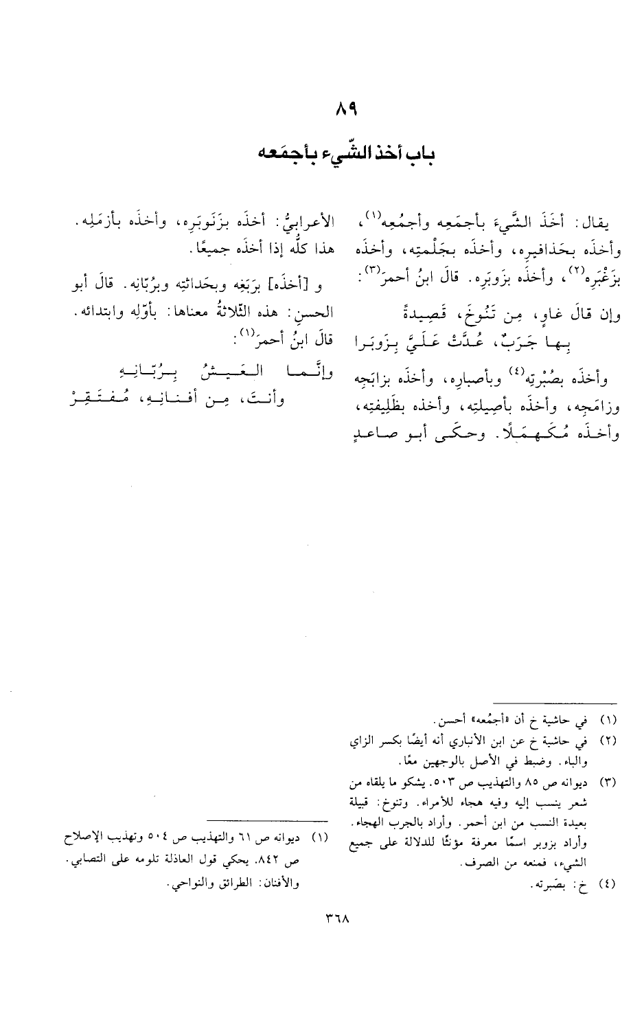 يقال: أخذ الشيء بأجمعه وأجمعه، وأخذه بحذافيره، وأخذه بجلمته، وأخذه بزغبره، وأخذه بزوبره. قال ابن أحمر: