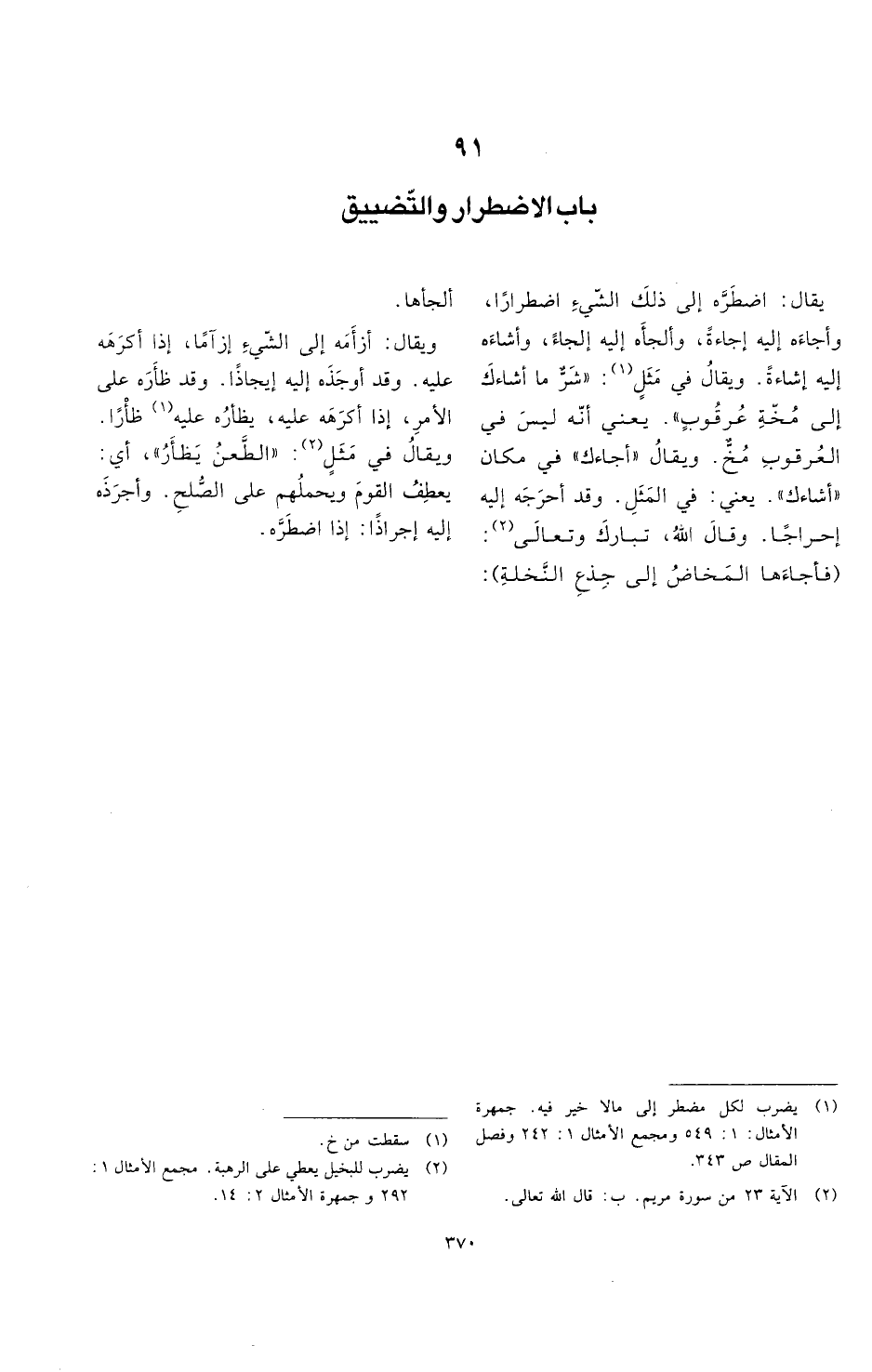 يقال: اضطره إلى ذلك الشيء اضطرارا، وأجاءه إليه إجاءة، وألجأه إليه إلجاء، واشاءه إليه إشاءة. ويقال في مثل: "شر ما أشاءك إلى مخة عرقوب". يعني أنه ليس في العرقوب مخ. ويقال "أجاءك" في مكان "أشاءك". يعني: في المثل. وقد أحرجه إليه إحراجا. وقال الله تبارك وتعالى: {فأجاءَها المَخاضُ إلى جِذعِ النَّخلةِ}: ألجأها.