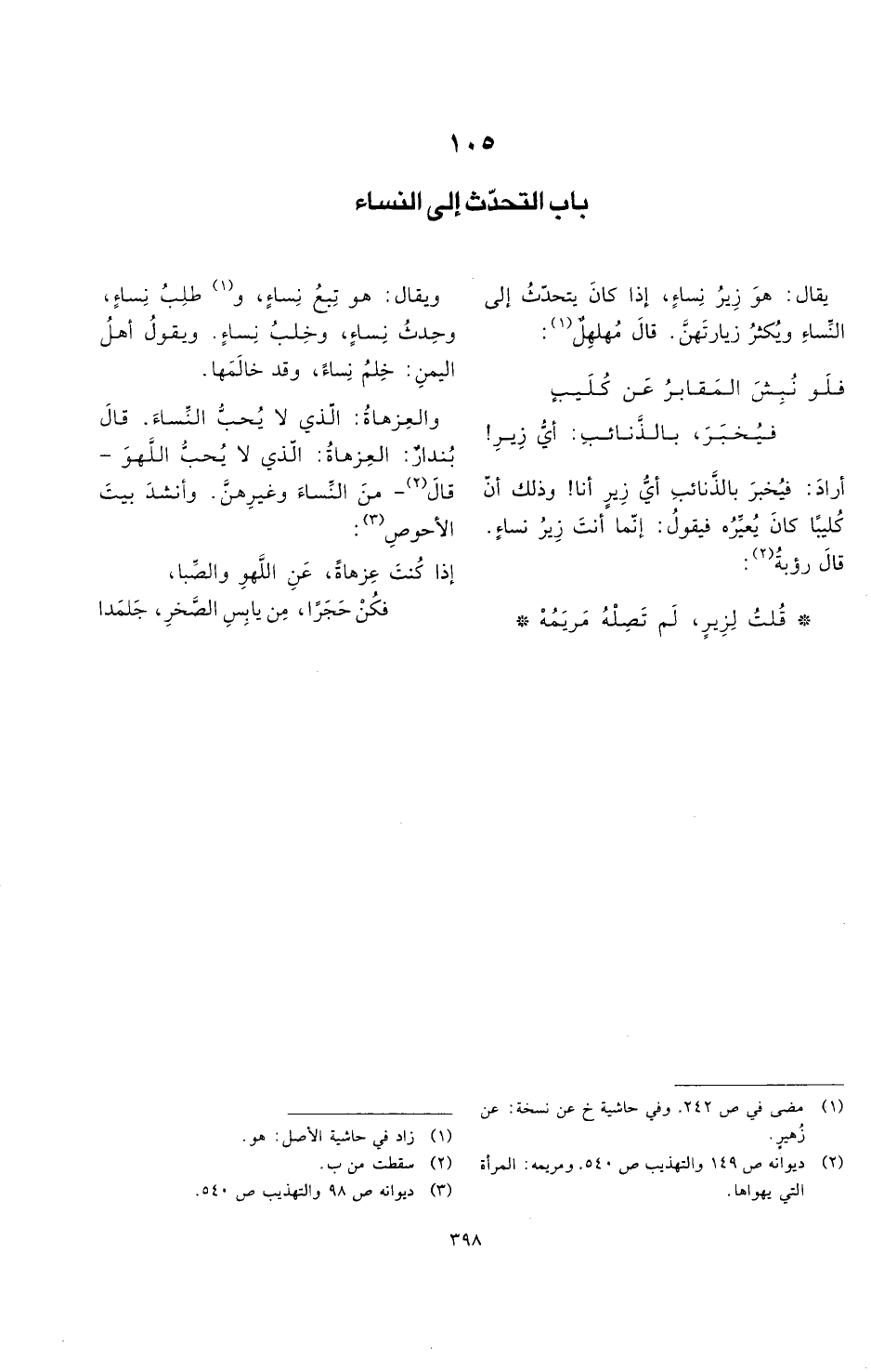 يقال: هو زير نساء، إذا كان يتحدث إلى النساء ويكثر زيارتهن. قال مهلهل:
