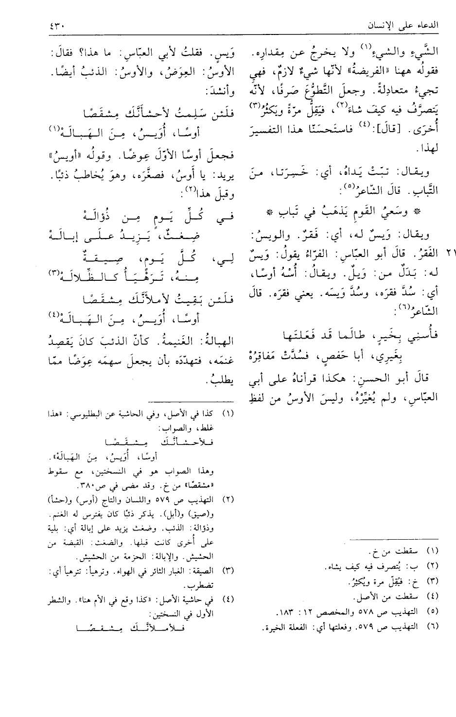 قال أبو الحسن: هكذا قرأناه على أبي العباس، ولم يغيره، وليس الأوس من لفظ ويس. فقلت لأبي العباس: ما هذا؟ فقال: الأوس: العوض، والأوس: الذئب أيضا. وأنشد: