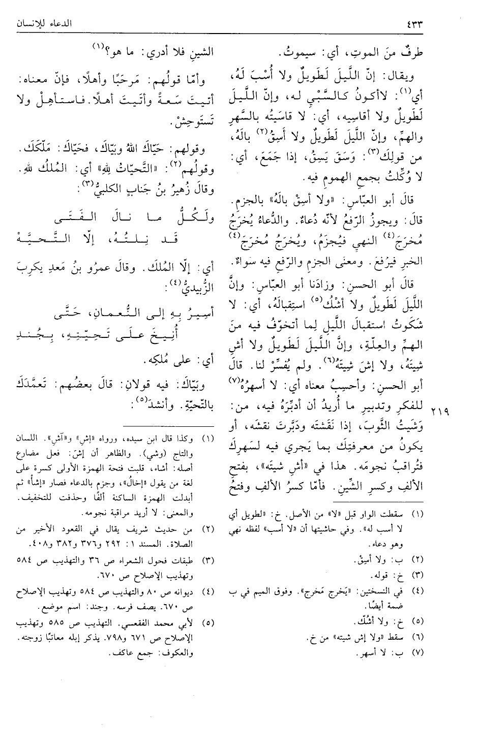 قال أبو الحسن: وزادنا أبو العباس: وإن الليل لطويل ولا أشك استقباله، أي: لا شكوت استقبال الليل لما أتخوف فيه من الهم والعلة، وإن الليل لطويل ولا أش شيته، ولا إش شيته. ولم يفسر لنا. قال أبو الحسن: وأحسب معناه أي: لا أسهره للفكر وتدبير ما أريد أن أدبره فيه، من: وشيت الثوب، إذا نقشته ودبرت نقشه، أو يكون من معرفتك بما يجري فيه لسهرك فتراقب نجومه. هذا في "أش شيته"، بفتح الألف وكسر الشين. فأما كسر الألف وفتح الشين فلا أدري: ما هو؟