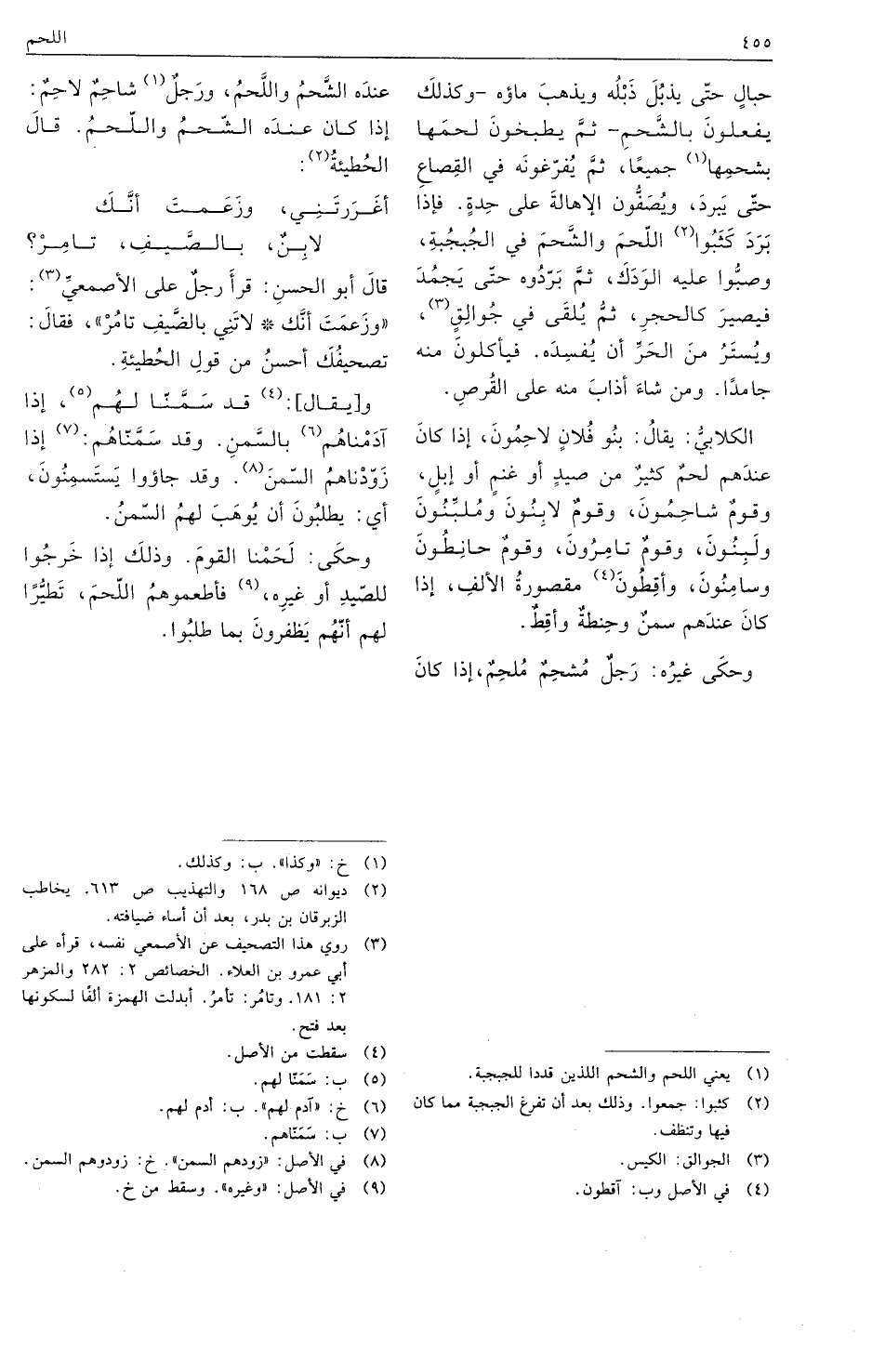 وحكى غيره: رجل مشحم ملحم، إذا كان عنده الشحم واللحم، ورجل شاحم لاحم: إذا كان عنده الشحم واللحم. قال الحطيئة: