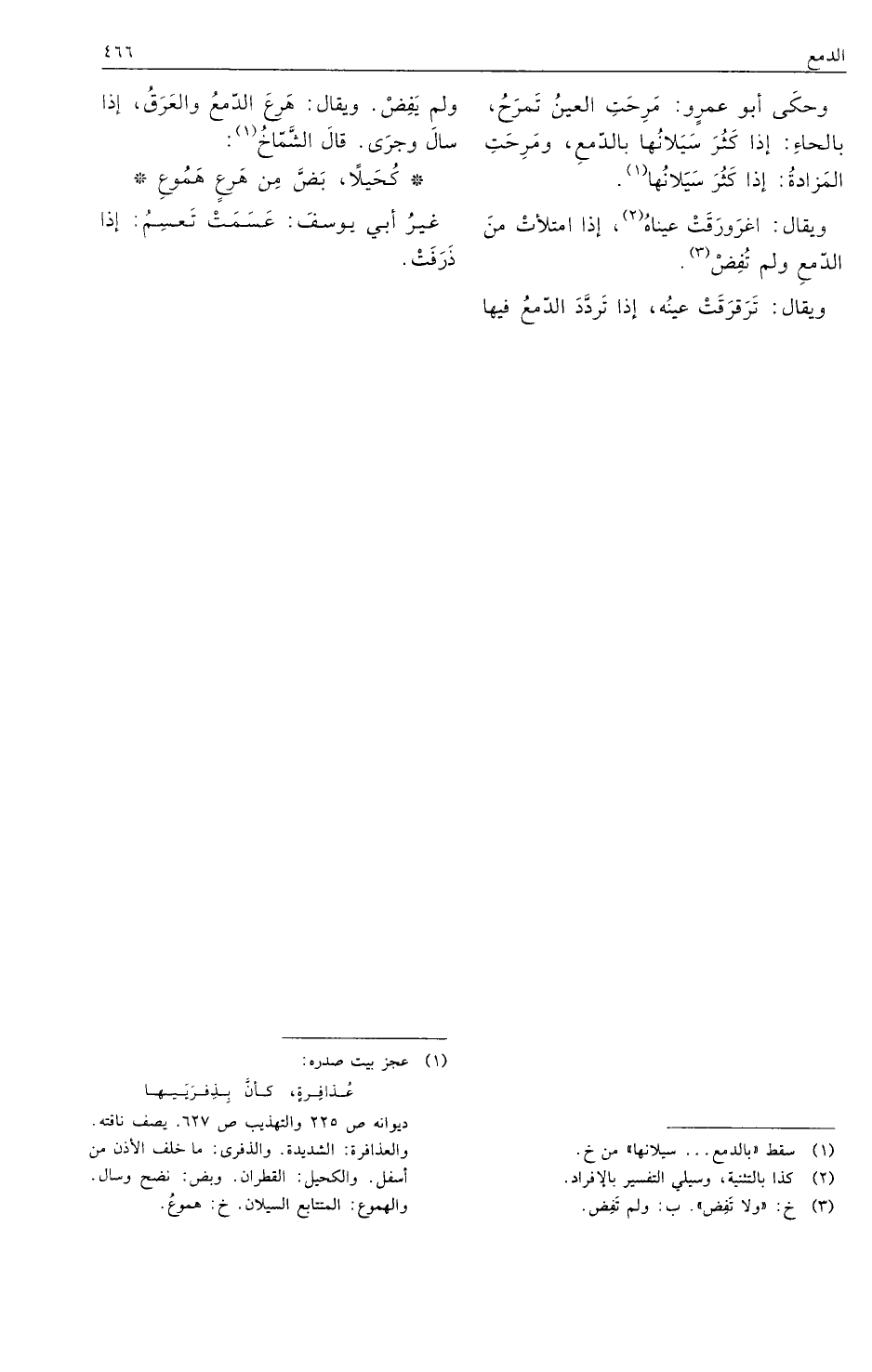 ويقال: ترقرقت عينه، إذا تردد الدمع فيها ولم يفض. ويقال: هرع الدمع والعرق، إذا سال وجرى. قال الشماخ: