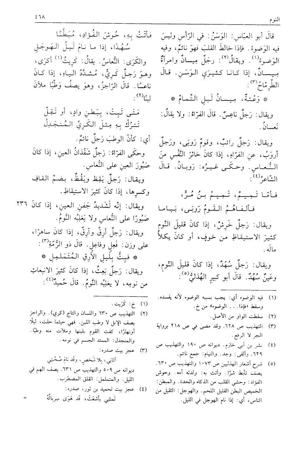 قال أبو العباس: الوسن: في الرأس وليس فيه الوضوء. فإذا خالط القلب فهو نائم، وفيه الوضوء. ويقال: رجل ميسان وامرأة ميسان، إذا كانا كثيري الوسن. قال الطرماح: