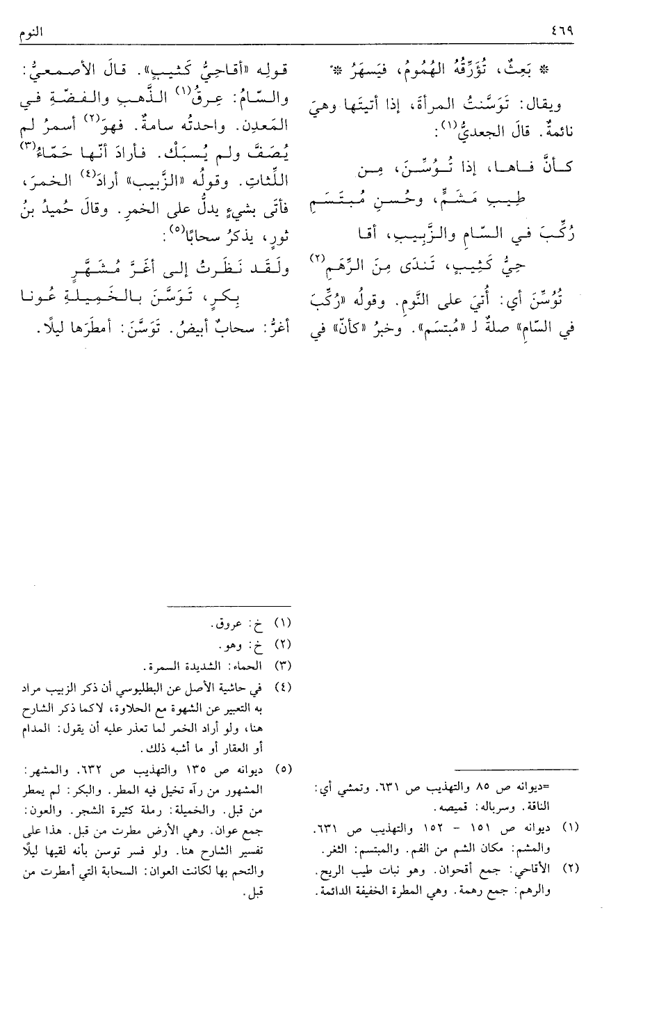 توسن أي: أتي على النوم. وقوله "ركب في السام" صلة لـ "مبتسم". وخبر "كأن" في قوله "أقاحي كثيب". قال الأصمعي: والسام: عرق الذهب والفضة في المعدن. واحدته سامة. فهو أسمر لم يصف ولم يسبك. فأراد أنها حماء اللثاث. وقوله "الزبيب" أراد الخمر، فأتى بشيء يدل على الخمر. وقال حميد بن ثور، يذكر سحابا: