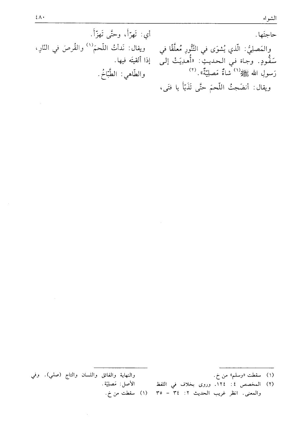 والمصلي: الذي يشوى في التنور معلقا في سفود. وجاء في الحديث: "أهديت إلى رسول الله صلى الله عليه وسلم شاة مصلية".