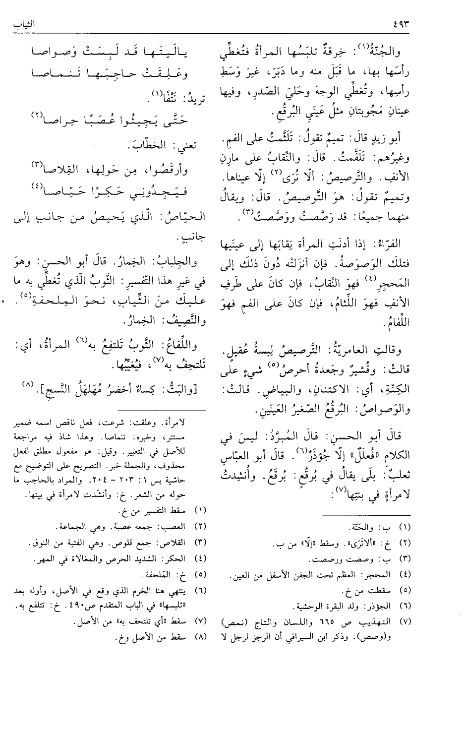 وقالت العامرية: الترصيص لبسة عقيل. قالت: وقشير وجعدة أحرص شيء على الكنة، أي: الاكتنان، والبياض. قالت: والوصوص: البرقع الصغير العينين.