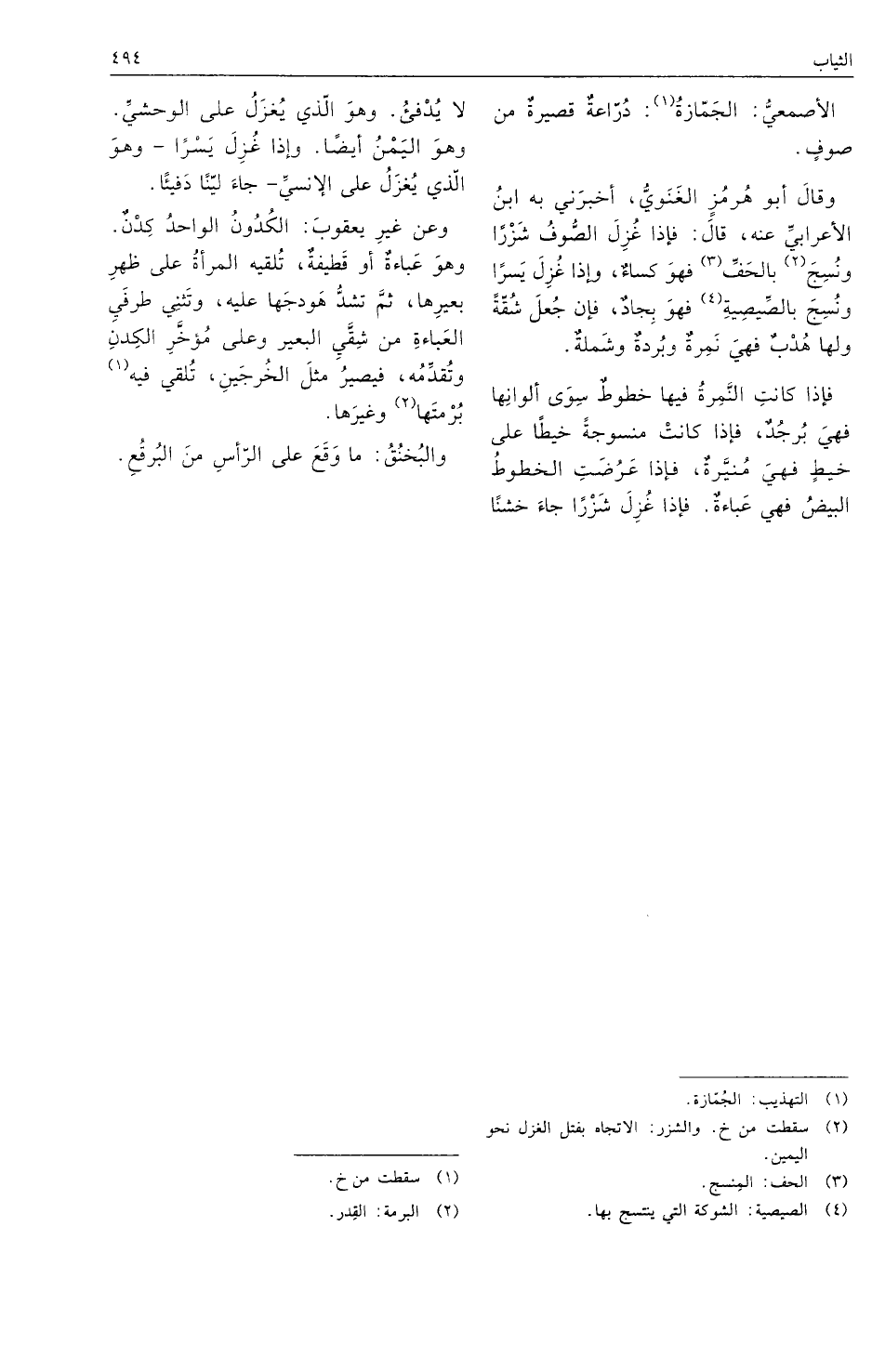 وقال أبو هرمز الغنوي، أخبرني به ابن الأعرابي عنه، قال: فإذا غزل الصوف شزرا ونسج بالحف فهو كساء، وإذا غزل يسرا ونسج بالصيصية فهو بجاد، فإن جعل شقة ولها هدب فهي نمرة وبردة وشملة.
