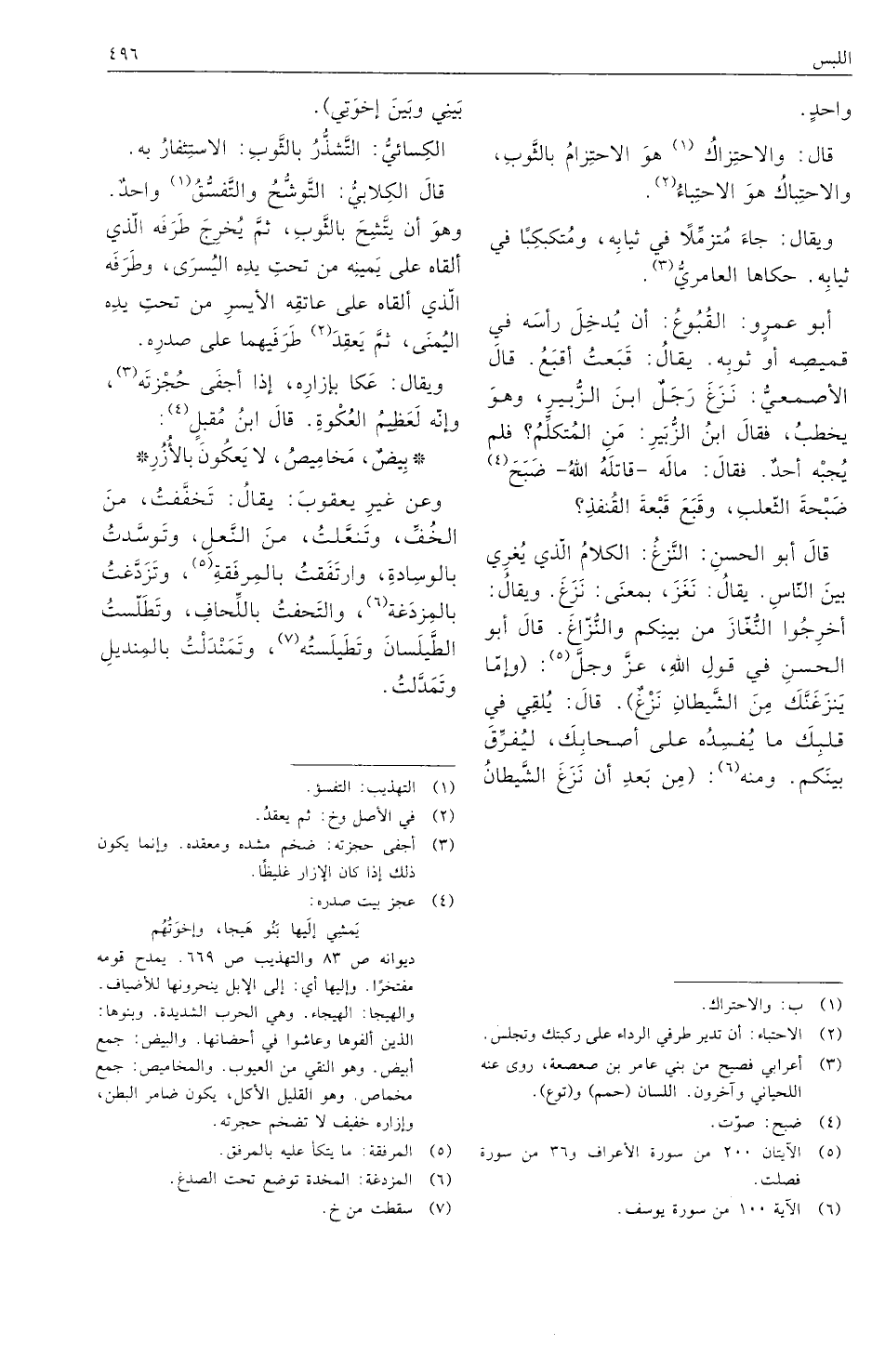 قال أبو الحسن: النزع: الكلام الذي يغري بين الناس. يقال: نغز، بمعنى: نزغ. ويقال: أخرجوا النغار من بينكم والنزاغ. قال أبو الحسن في قول الله عز وجل: {وإمّا يَنزَغَنَّكَ مِنَ الشَّيطانِ نَزْغٌ}. قال: يلقي في قلبك ما يفسده على أصحابك، ليفرق بينكم. ومنه: {مِن بَعدِ أن نَزَغَ الشَّيطانُ بَينِي وبَينَ إخوَتِي}.