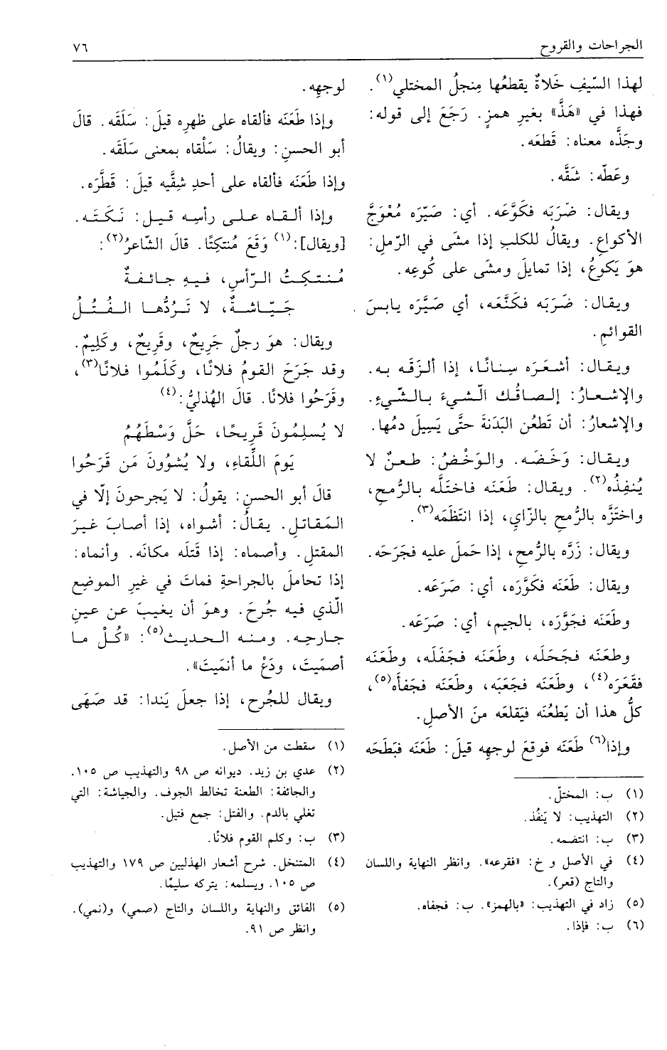 قال أبو الحسن: يقول: لا يجرحون إلا في المقاتل. يقال: أشواه، إذا أصاب غير المقتل. وأصماه: إذا قتله مكانه. وأنماه: إذا تحامل بالجراحة فمات في غير الموضع الذي فيه جرح. وهو أن يغيب عن عين جارحه. ومنه الحديث: "كل ما أصميت، ودع ما أنميت".