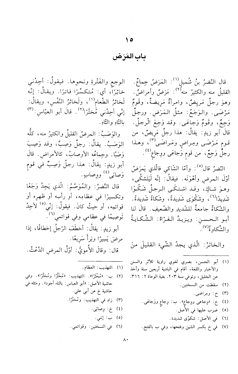 قال النضر بن شميل: المرض جماع. القليل منه والكثير منه: مرض وأمراض. وهو رجل مريض، وامرأة مريضة، وقوم مرضى. والوجع: مثل المرض. ورجل وجع، وقوم وجاعى. وقد وجع الرجل. قال أبو زيد: يقال: هذا رجل مريض، من قوم مرضى ومراض ومراضى، وهذا رجل وجع، من قوم وجاعى ووجاع.