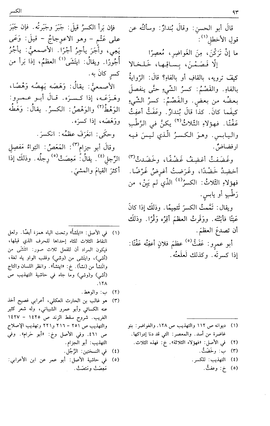 كيف ترويه، بالقاف أو بالفاء؟ قال: الرواية بالفاء. القصم: كسر الشيء حتى ينفصل بعضه من بعض. والفصم: كسر الشيء كيفما كان. كذا قاغل بندار. وعفت أعفت عفتا. فهؤلاء الثلاث يكن في الرطب واليابس. وهو الكسر الذي ليس فيه ارفضاض.