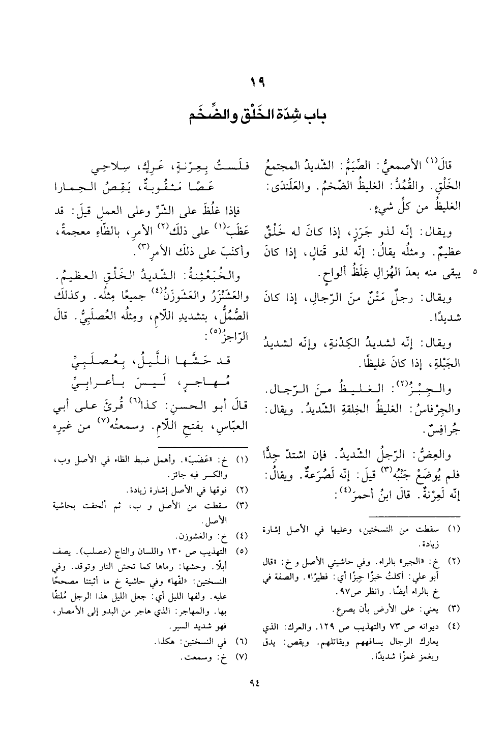 والخبعثنة: الشديد الخلق العظيم. والعشنزر والعشوزن جميعا مثله. وكذلك الصمل، بتشديد اللام، ومثله العصلبي. قال الراجز: