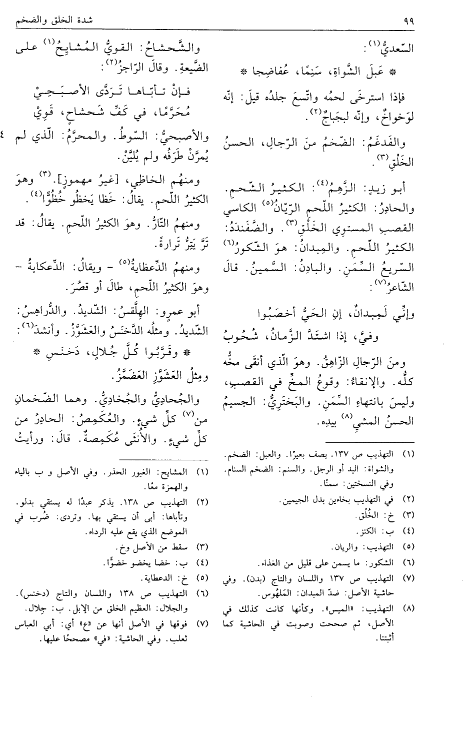 أبو زيد: الزهم: الكثير الشحم. والحادر: الكثير اللحم الريان الكاسي القصب المستوي الخلق. والضفندد: الكثير اللحم. والمبدان: هو الشكور السريع السمن. والبادن: السمين. قال الشاعر: