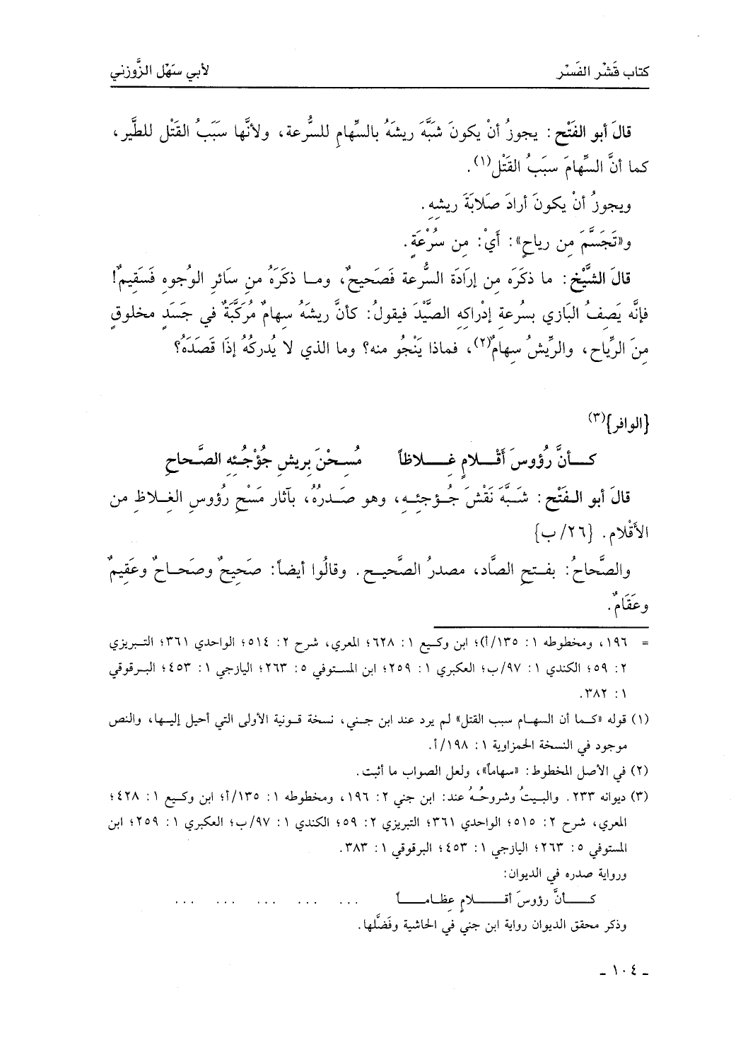 قال الشيخ: ما ذكره من إرادة السرعة فصحيح، وما ذكره من سائر الوجوه فسقيم، فإنه يصف البازي بسرعة إدراكه الصيد، فيقول: كان ريشه سهام مركبه في جسد مخلوق من الرياح والريش سهاماً فماذا ينجو منه؟ وما الذي لا يدركه إذا قصده؟