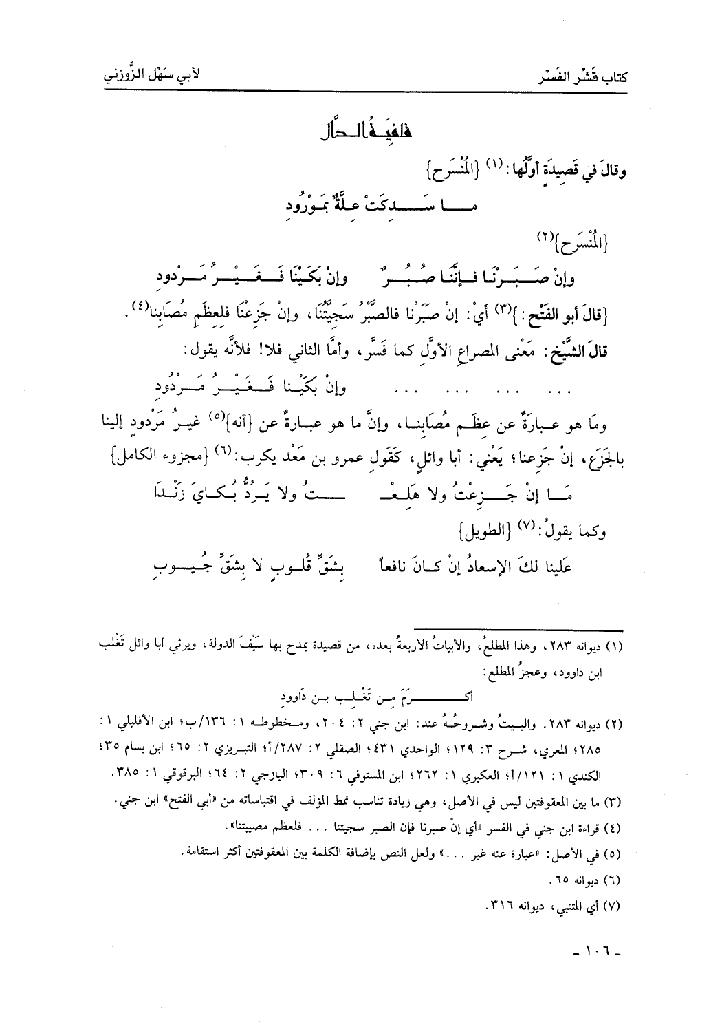 قال الشيخ: معنى المصراع الأول كما فسر، وأما الثاني فلا، فلأنه يقول: وإن بكينا فغير مردود، وما هو عبارة عن عظم مصابنا، وإنما هو عبارة عنه غير مردود إلينا الجزع، إن جزعنا، يعني أبا وائل، كقول عمرو بن معدي كرب:
