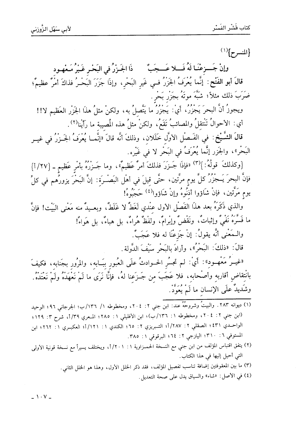 قال أبو الفتح: أي إنما يُعرف الجزر في غير البحر، وإذا جُزر البحر فذاك أمر عظيم. ضرب ذلك مثلاً شبه موته بجزر البحر، ويجوز أن يكون المعنى البحر يجزر، أي: يجزر ما يتصل به، ولكن مثل هذا الجزر العظيم لأي: الأحوال تنتقل؟ والمعنى إن المصائب قد تقع، ولكن على مثل هذه المصيبة ما رأينا.