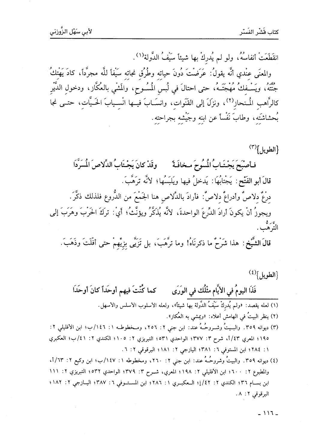 انقطعت أنفاسه، ولو لم يدرك بها شيئاً سيف الدولة. والمعنى عندي، إنه يقول: عرضت دون حياته وطرق نجاته سيف الله مجرداً كاد يهتك جثته ويسفك مهجته حتى احتال في لبس المسموح والمشي بالعكاز ودخول الدير كالراهب المنحاز ونزل إلى القنوات، وانساب بينهما انسياب الحيات حتى نجا بحُشاشته، وطاب نفساً عن أبنه وجيشه بجراحته.