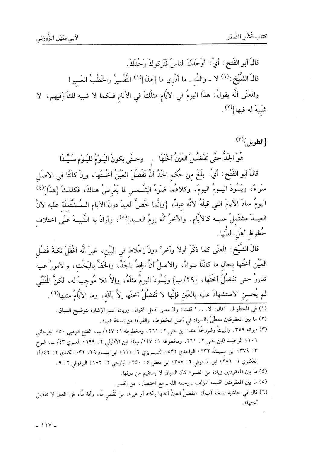 قال الشيخ: المعنى كما ذكر أولاً وأخراً دون إخلاط في البين، غير أنه أغفل نكتة فضل العين على أختها بحال ما كانتا سواء، والأصل أن الجد بالجد والحظ بالبخت، والأمور عليه تدور حتى تفضل أختها، ويسود اليوم مثله وإلا فلا موجب له. لكن المتنبي لم يحسن الاستشهاد عليه بالعين، فإنها لا تفضل أختها إلا بآفةٍ وما الأيام مثلها.